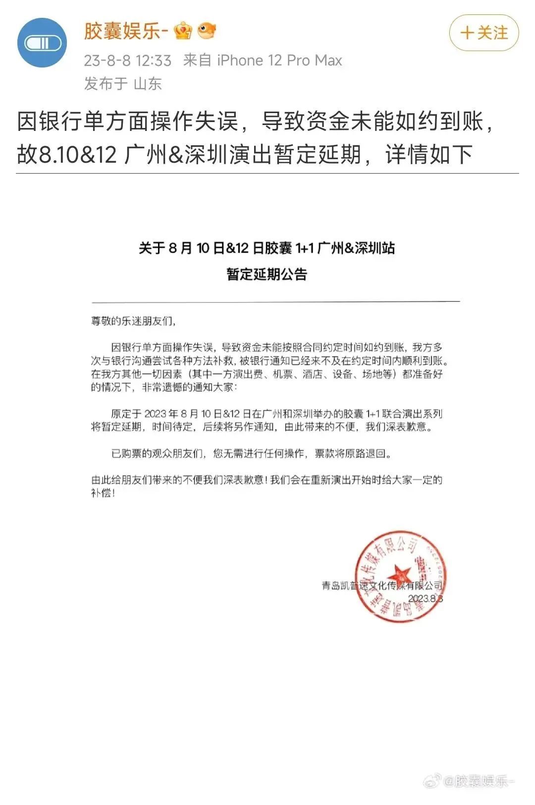 近一个月,“胶囊娱乐”已接连取消或延期了四场演出,如原定7月27日举办的生祥乐队和惘闻的联合演出,也因“生祥乐队部分乐手入境签注遇到困难”延期。