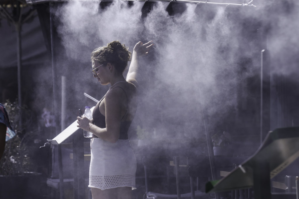 7月23日,在希腊雅典一家咖啡馆外,一名女子在喷雾风扇下乘凉。图据新华社