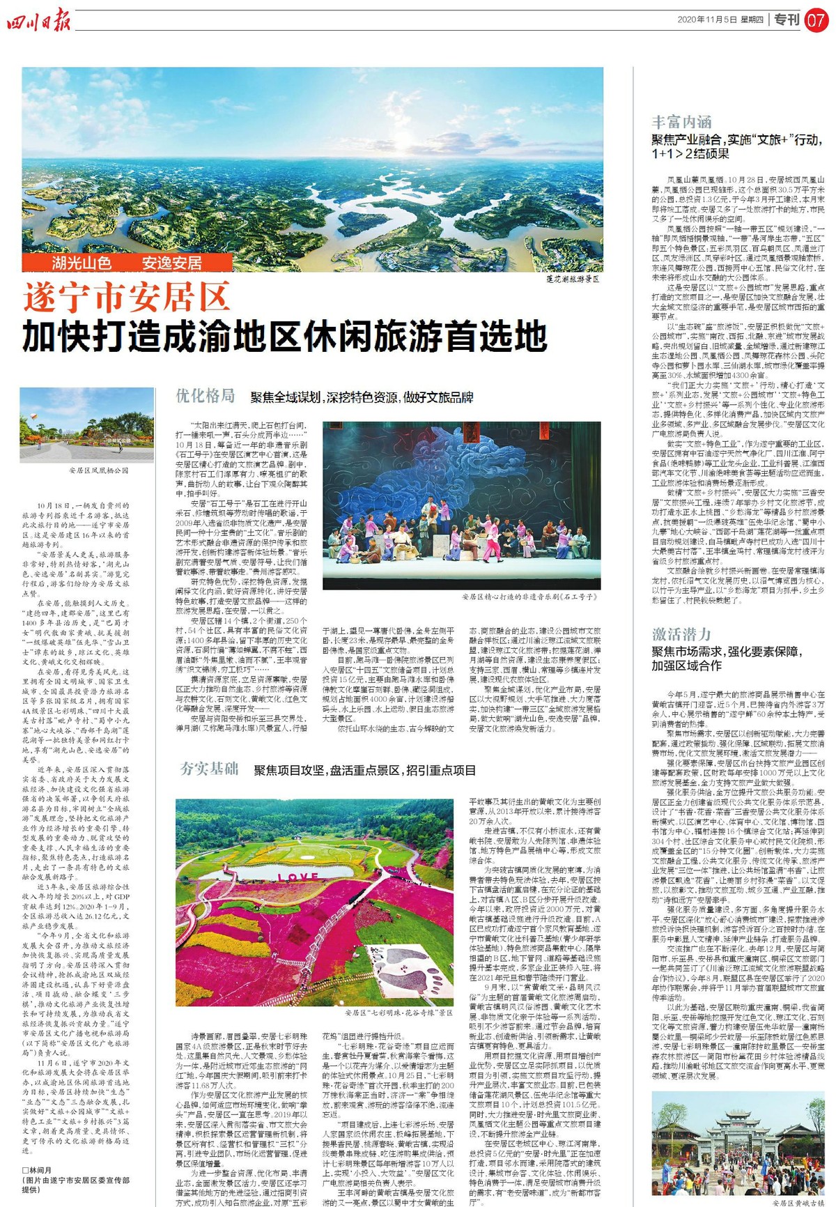 聚焦全域谋划,优化产业布局,安居区以大视野规划、大手笔推进、大力度落实,加快构建“一带三区”全域旅游发展格局,做大做响“湖光山色,安逸安居”品牌,安居文化旅游焕发新活力。