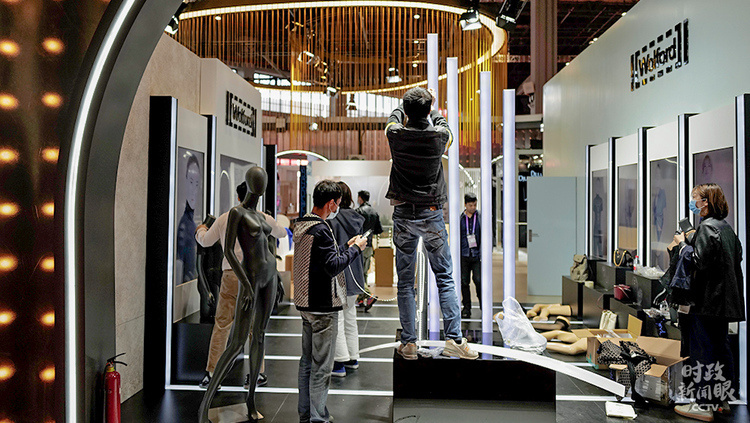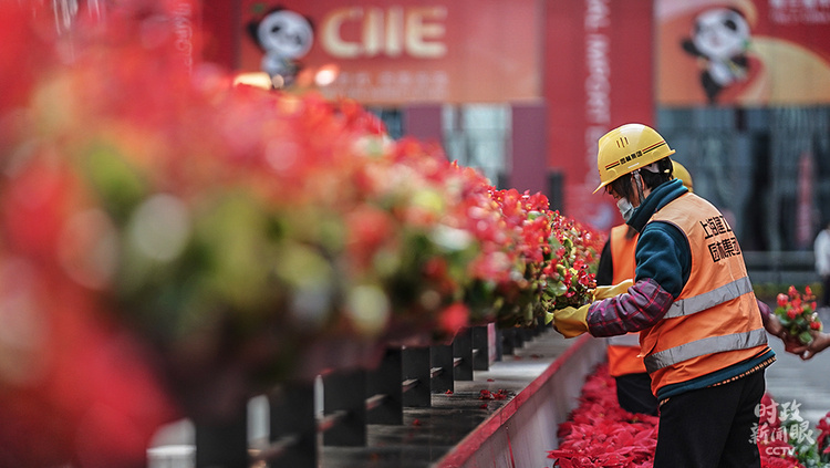 △进博会开幕前,工作人员做最后的整理、布展等工作。(总台国广记者李晋拍摄)