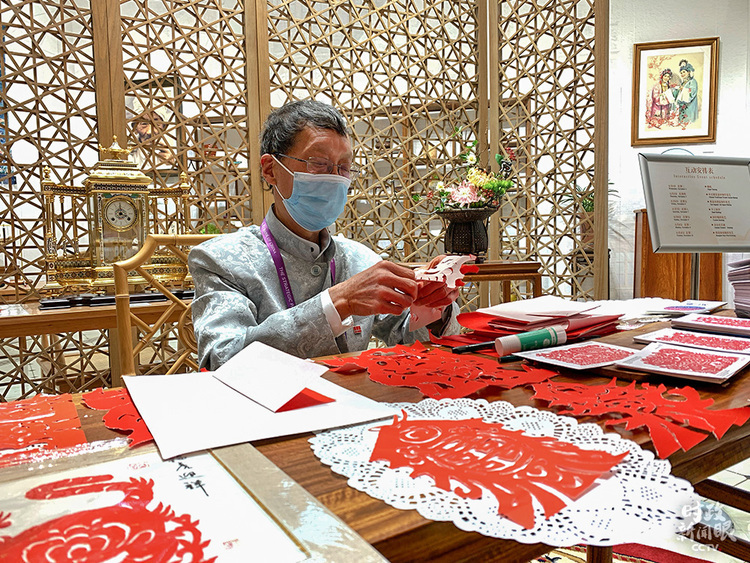△这是上海市非遗海派撕纸项目代表性传承人华兴富,他可以徒手运用撕、挖、抠、镂等手法技巧,制作出栩栩如生的人像、生肖、窗花等撕纸作品。(总台央视记者程铖拍摄)