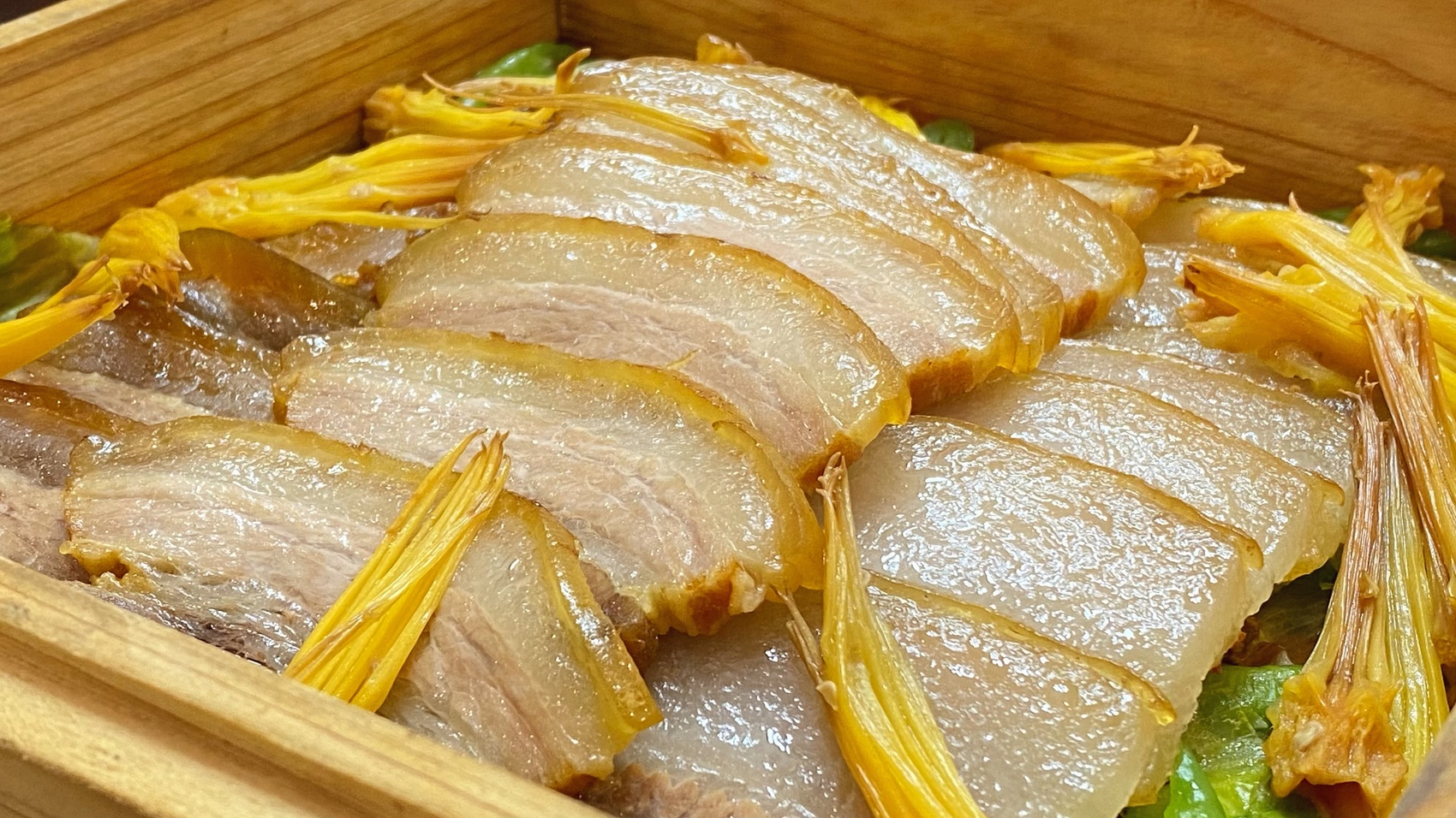 新推出的攀西风味特色菜品之一攀枝花蕊炒油底肉。图据受访者。