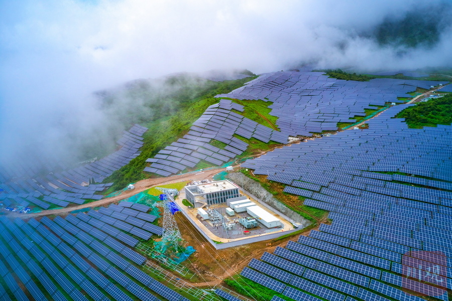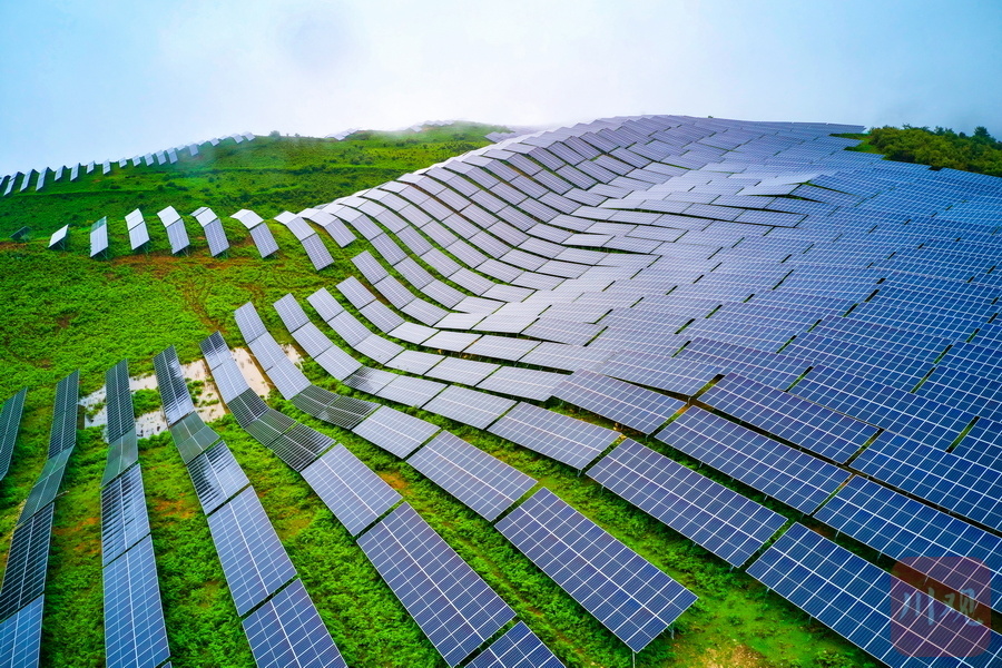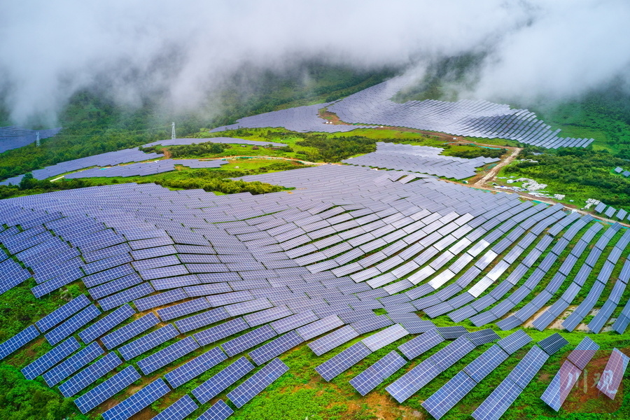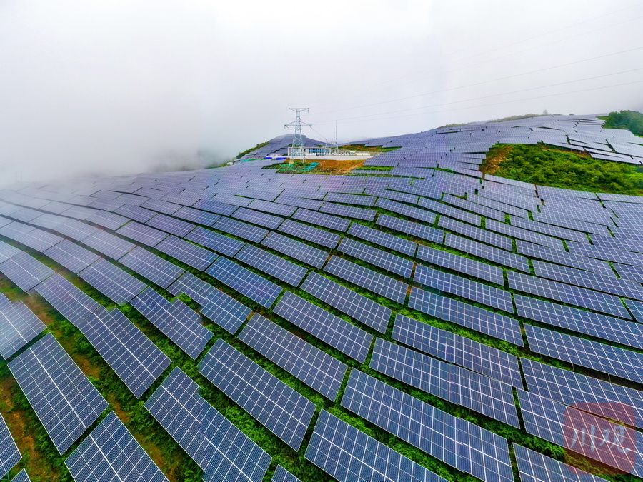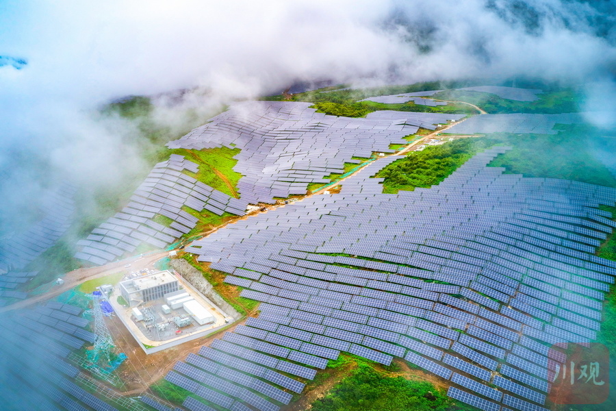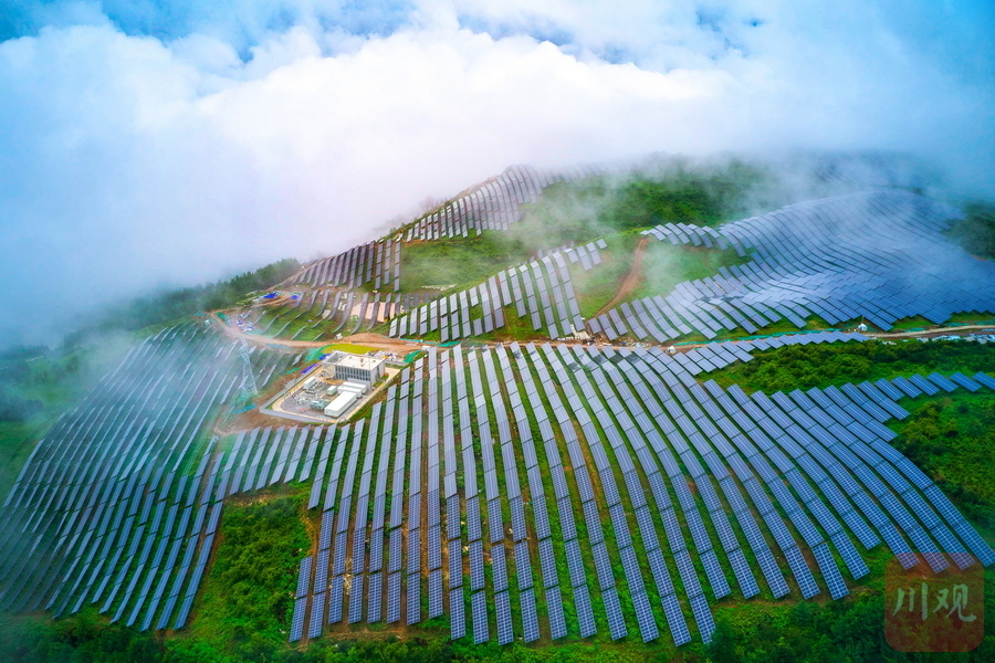云雾缠绵,一排排光伏板沿山而上、连线成片……8月13日,沐浴着清凉的秋雨走进雅安石棉县回隆镇竹马村,建设于青山间的石棉竹马10万千瓦林光互补复合光伏电站项目格外显眼,一排排连绵而整齐的光伏板,勾勒出一道壮丽的风景线。
