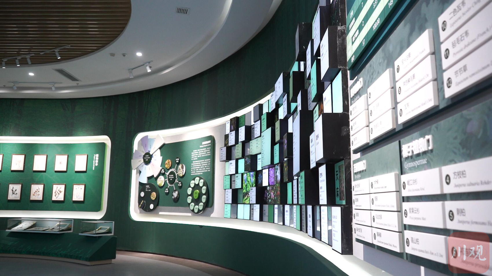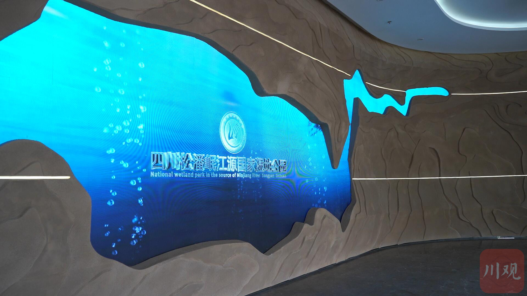 岷江源国家湿地公园科普馆整个展厅分为三部分,建筑面积约为3500平方米,包括一楼的自然厅、二楼的文化厅和科技厅。走进岷江源自然厅,绿色和原木色为主的展厅营造出柔和的生态感,游客可以从这里出发,开启湿地探索,探索生命与自然的源头。岷江源起、资源共生、隽美景观、保江护源等版块内容一一呈现。与自然厅不同的是,文化厅整体的风格更加沉稳一些,顶部是以江源文化4个字形成的艺术印章,寓意着由岷江源出发,烙印在中华文明历史中的宏伟印记,长江源纪、江水灵源、江源文明、红军过草地、民俗民风依次展现;而在科技厅,游客则能领略科技赋能下的沉浸式松潘美景。