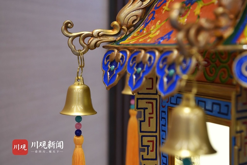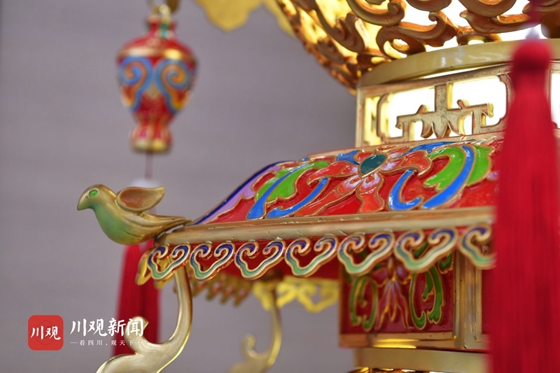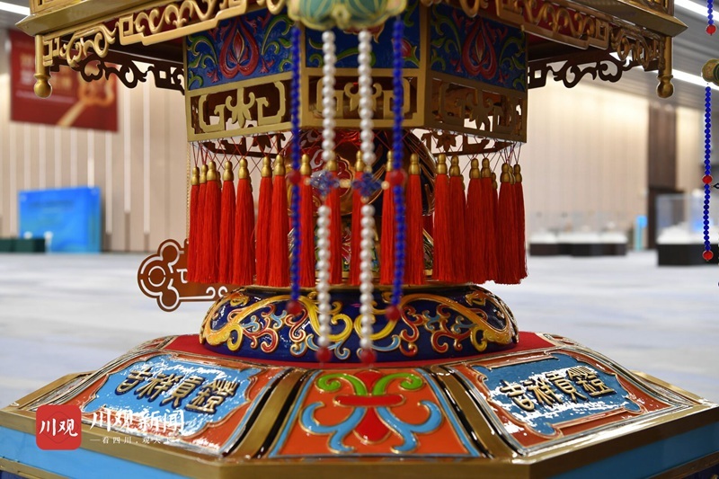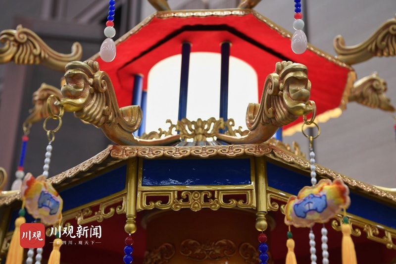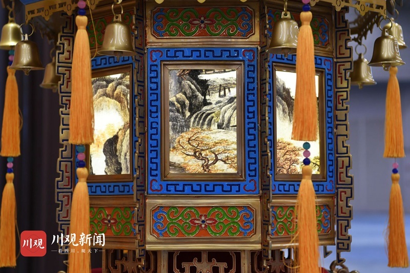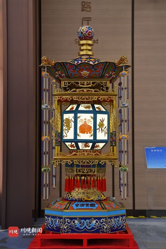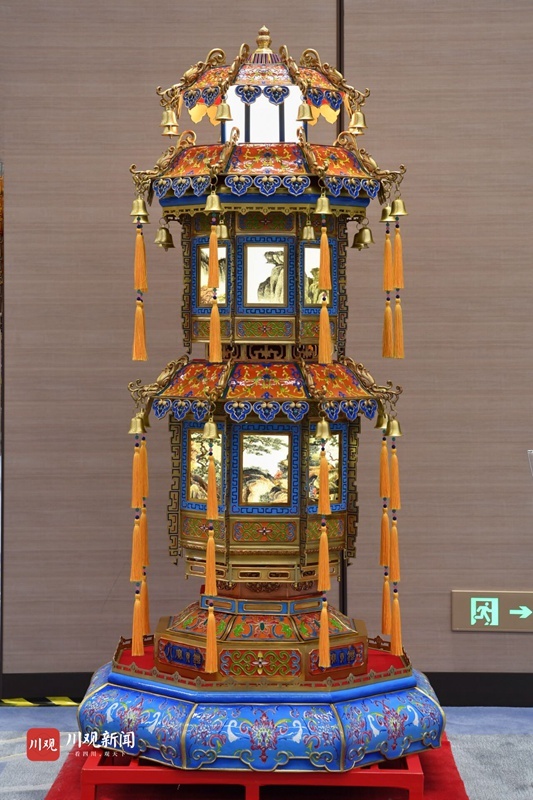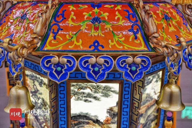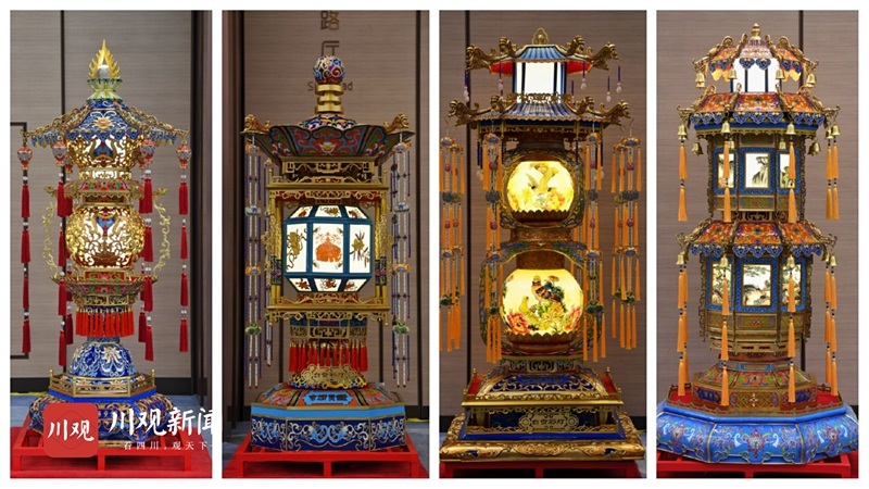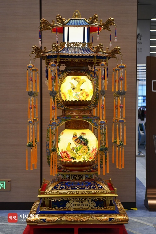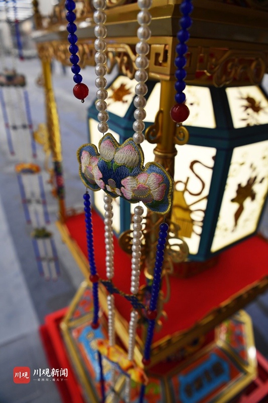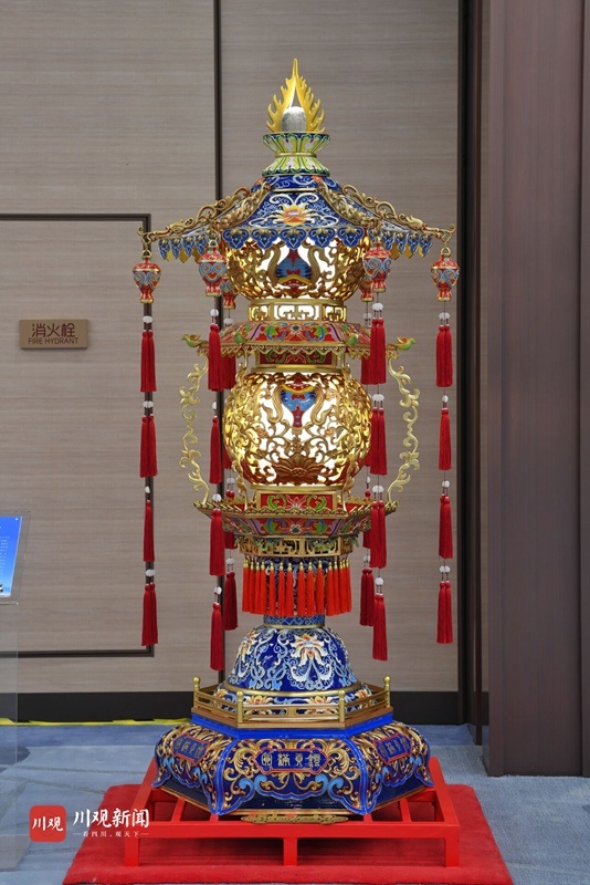 4座贡灯每组高2.3米,重400余公斤,是国内同类宫灯中体量最大的宫灯,融合了我国大江南北非遗技艺中的传统彩灯、珐琅彩、手工刺绣、玻璃内画、铜胎铸造、手工刺绣、玉雕等工艺,实属罕见。
