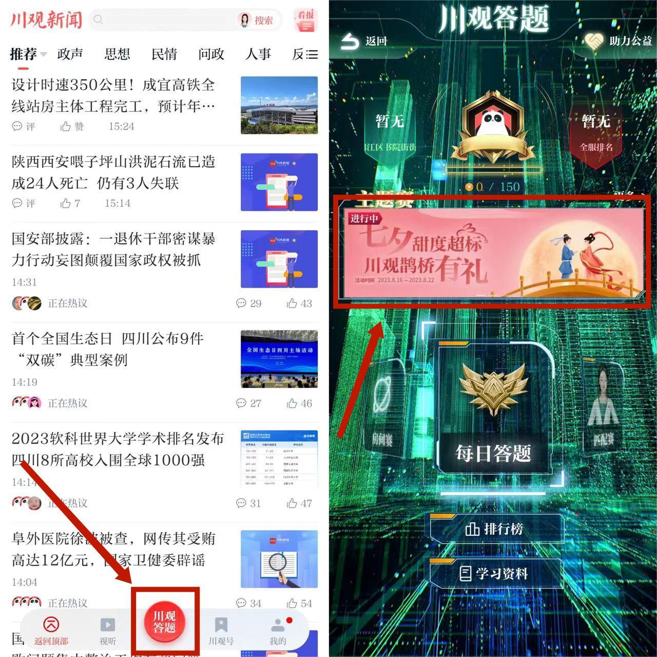 方式一:在川观新闻首页,点击“川观答题”,找到“七夕甜度超标 川观鹊桥有礼”活动图片,点击参与活动即可参与七夕答题;