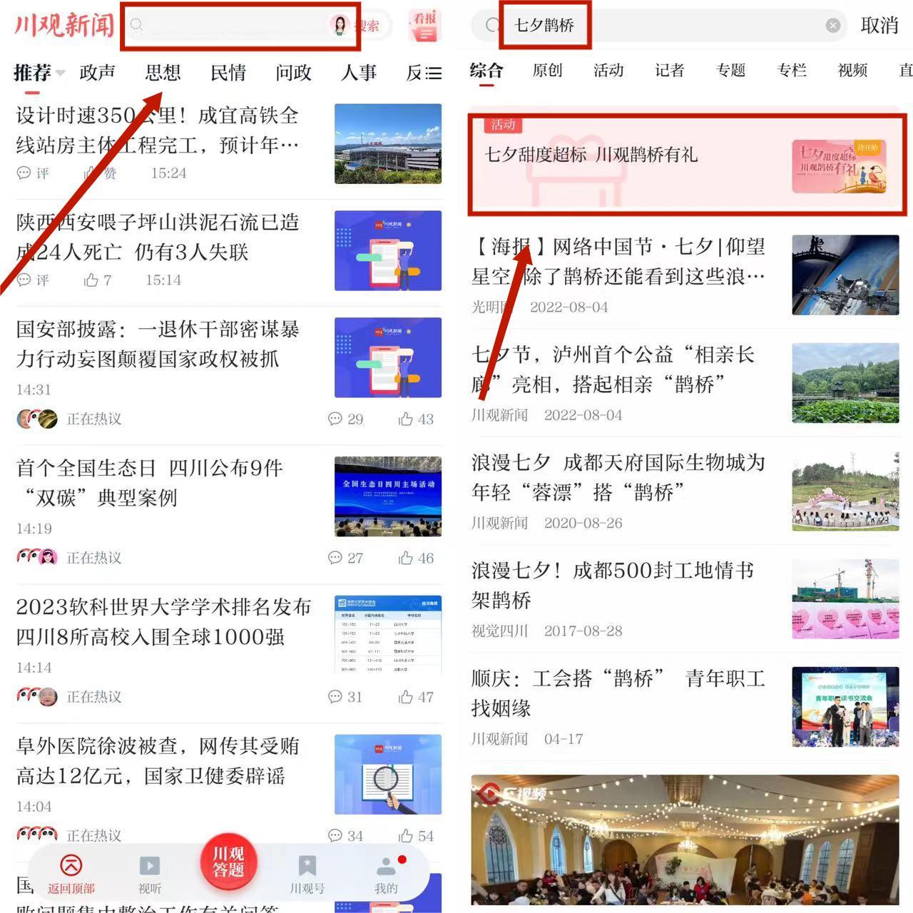方式二:在川观新闻首页顶部搜索框输入“七夕鹊桥”,点击活动链接即可参与;