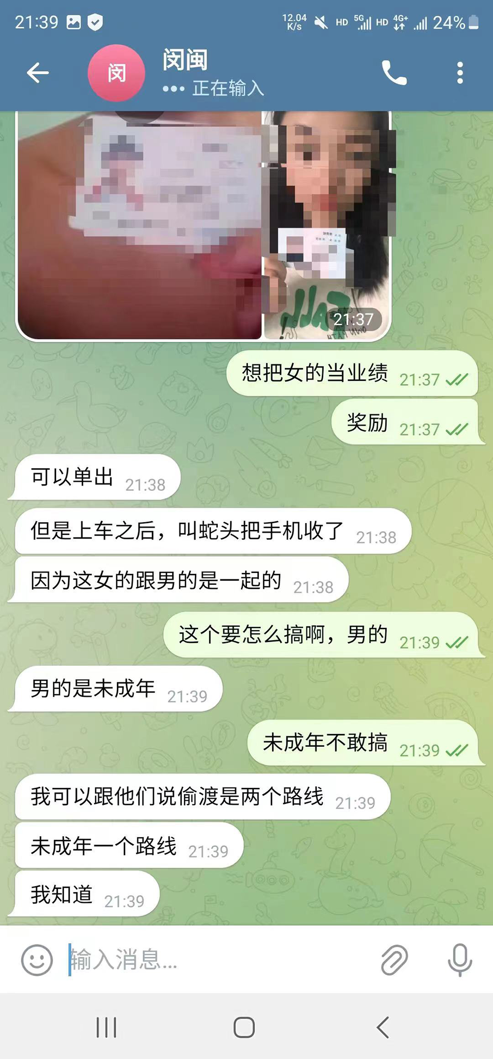 网传聊天记录截图显示,一名叫“闵闽”的网友在社交群称:“昆明出两个人,一个22岁女大学生,一个17岁未成年人。”8月3日,有网友私聊“闵闽”问女大学生如何交易,“闵闽”回复称“女生单出12万”、“明天这两个必须我要送走了”、“上车之后叫蛇头把手机收了”、“明天中午你那边安排蛇头接人”。