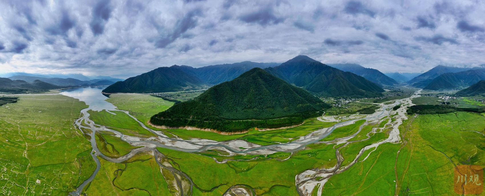 最高海拔超过4700米的阿嘎拉玛山下,有一块水草丰沛的湿地草场,蓝天白云下,成群的牛羊在绿色草地上悠闲觅食,小溪奔流,潺潺水声,给这幅绝美风光增添许多宁静和生动。