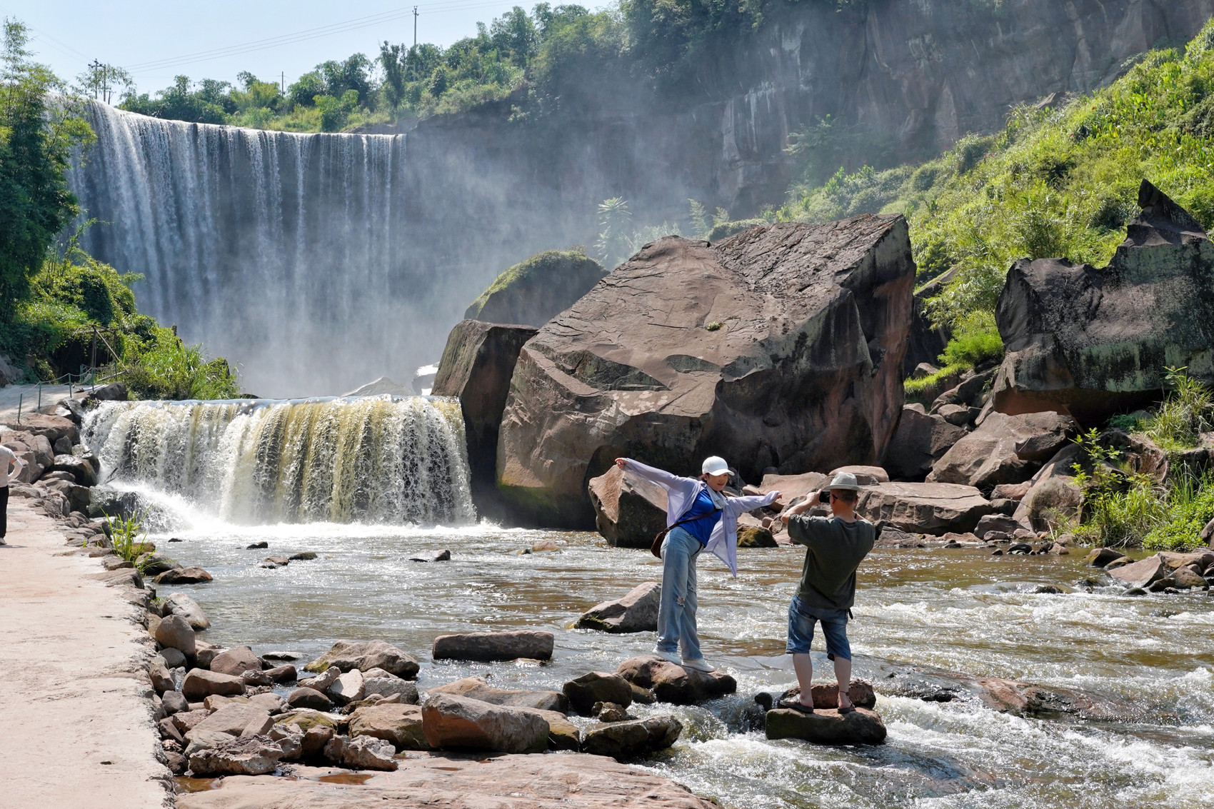 游客两两成群以低坑大瀑布为背景拍照。 吴迪 摄