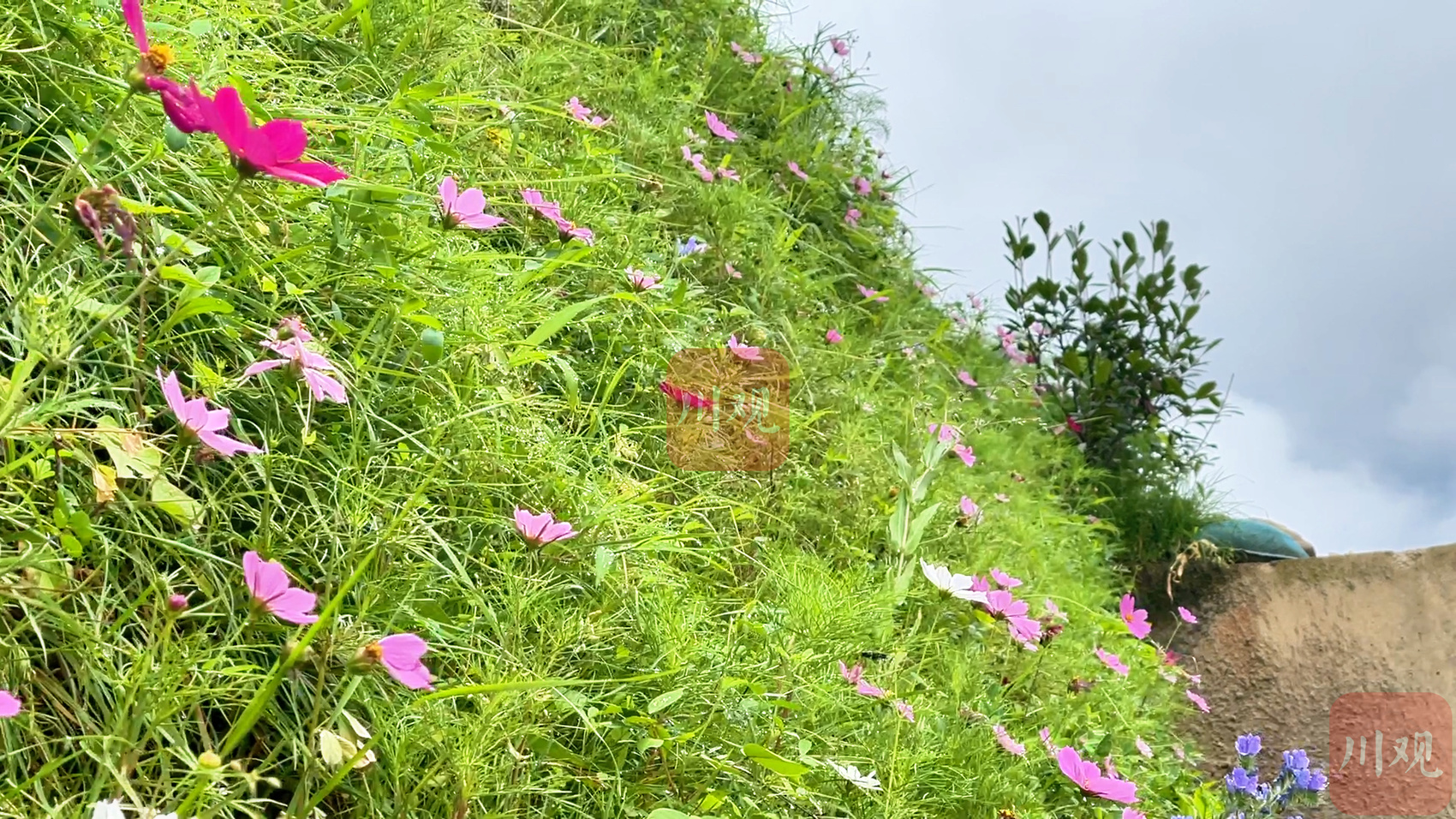 海螺沟景区道路边坡修护后植绿,山花灿烂。