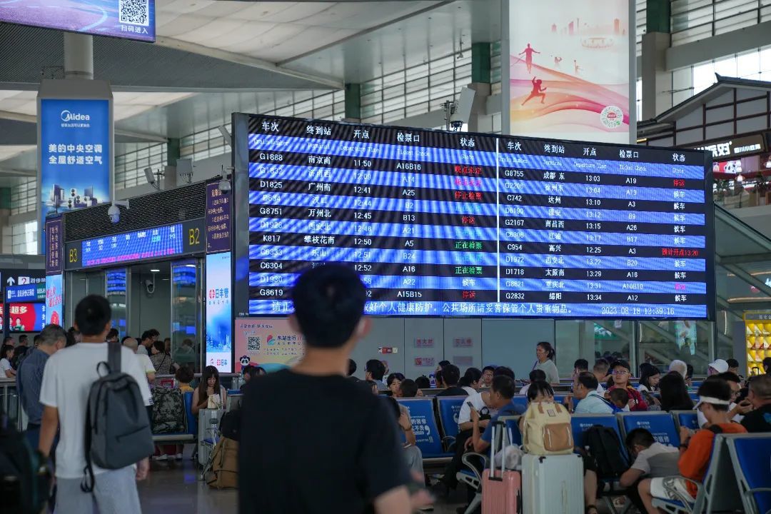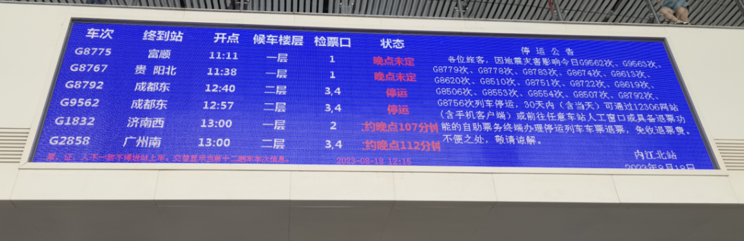 内江北站大屏显示列车晚点信息