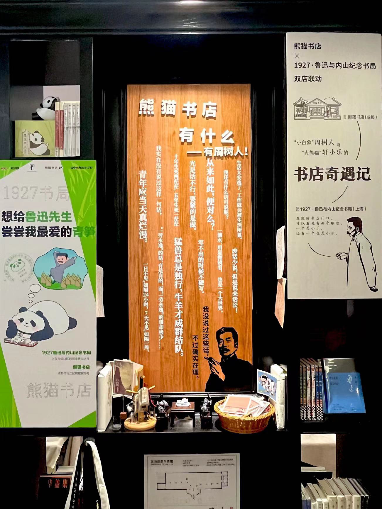 是的,轩小乐来自成都。8月,借2023上海书展的东风,由新华文轩打造的首家熊猫书店,与“1927·鲁迅与内山纪念书局”,特别合作,推出了“1927书局×熊猫书店:在四川北路遇见爱读鲁迅的轩小乐”的联动——两家主题书店内都各自设置以对方元素为主题的图书文创展销专架,“花花”到了书局,高仿真玩偶让上海读者足不出“沪”感受顶流女明星的可爱。
