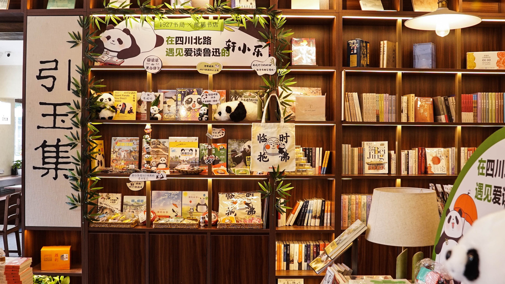 在书局里走走逛逛,里面陈设的,有《熊猫花花》《熊猫王》《追踪大熊猫》《大熊猫童话》等书籍,和它们放在一起的,是《呐喊》《朝花夕拾》《鲁迅家书》《鲁迅回忆录》《鲁迅十五讲》……还有趴着的“花花”玩偶,就是它!让每个路过的顾客都忍不住拿起来抚摸一下,合影留念。
