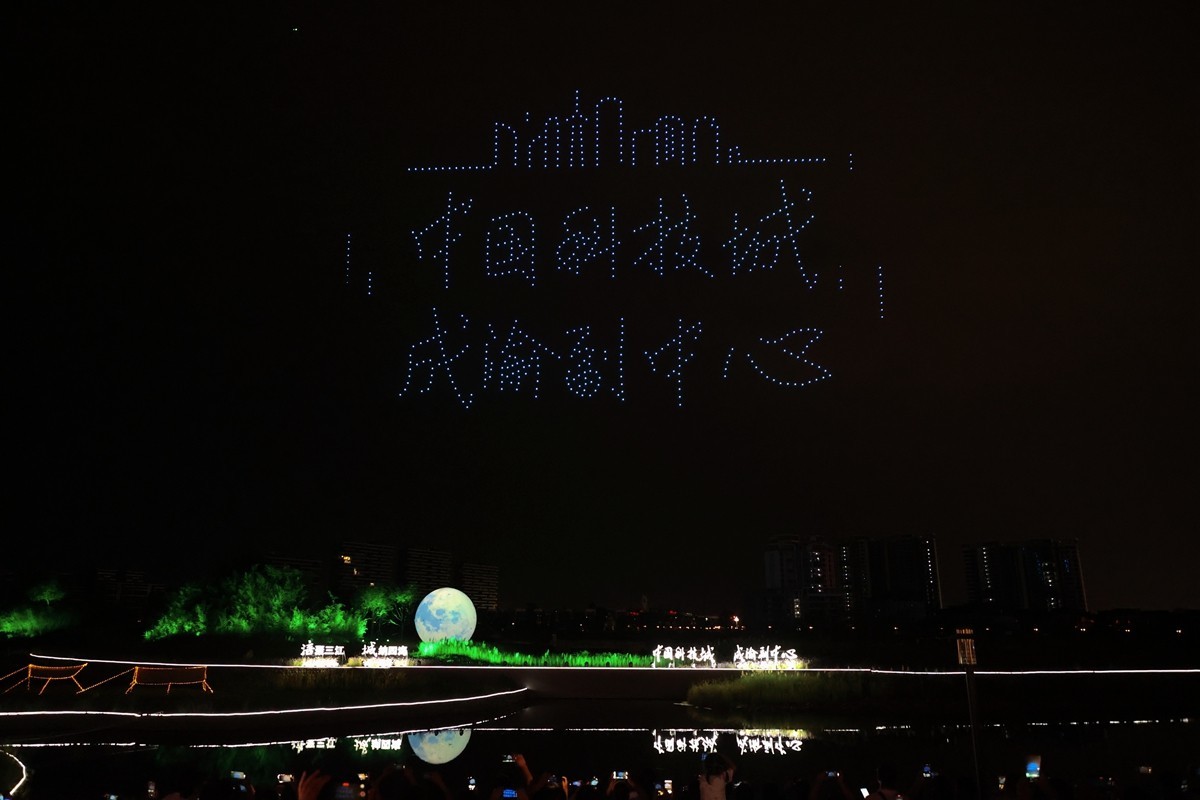 晚上7时,在四川绵阳工业园(北区)金西湖广场,伴随着悠扬的旋律,无人机表演暨湖畔音乐会拉开序幕,在《千古绝唱醉翁亭》、涪城非遗脱手变脸、《科技城之约》等文艺表演后,,现场表演进入高潮——700余架无人机以天为幕布、以光为画笔,上下翻飞、切换走位,“中国科技城 成渝副中心”“涪聚三江 城纳四海”“绵阳星座‘涪城一号’”等图案在夜空之中闪烁,收获了大量称赞和掌声。