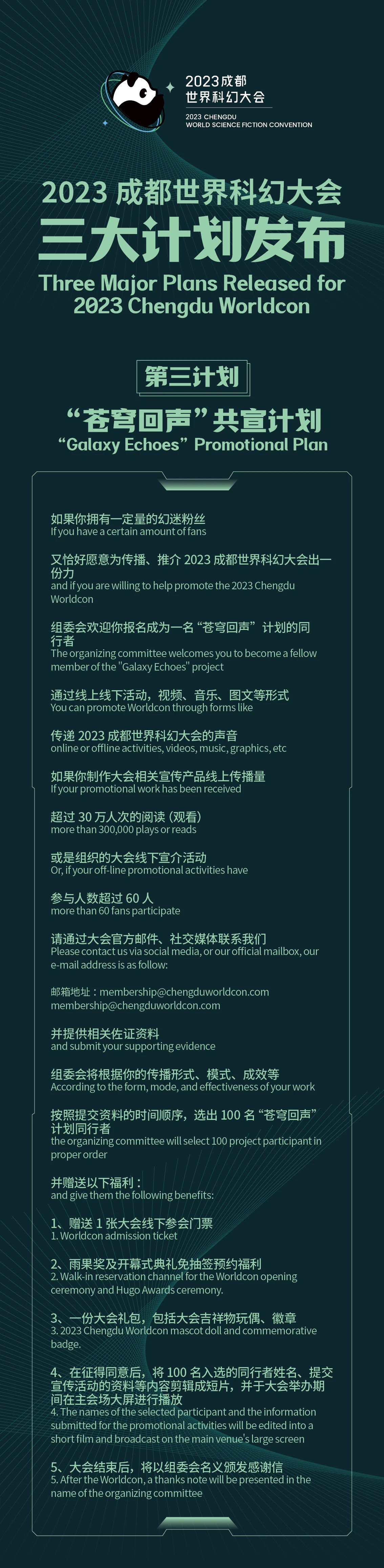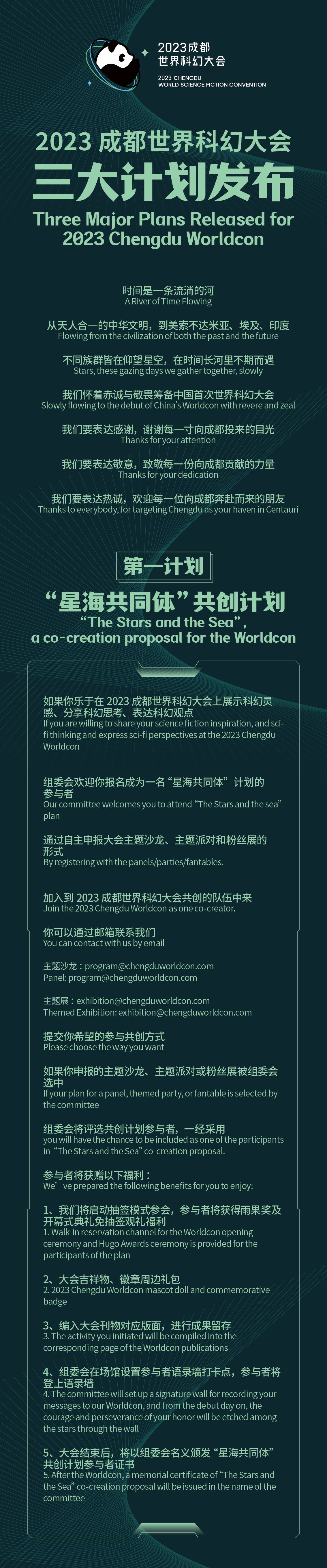 在本次世界科幻大会筹备期间,特为幻迷准备了一系列专属福利计划,首批 发布的有“星海共同体”共创计划、“百分之一光秒”共享计划及“苍穹回声” 共宣计划。