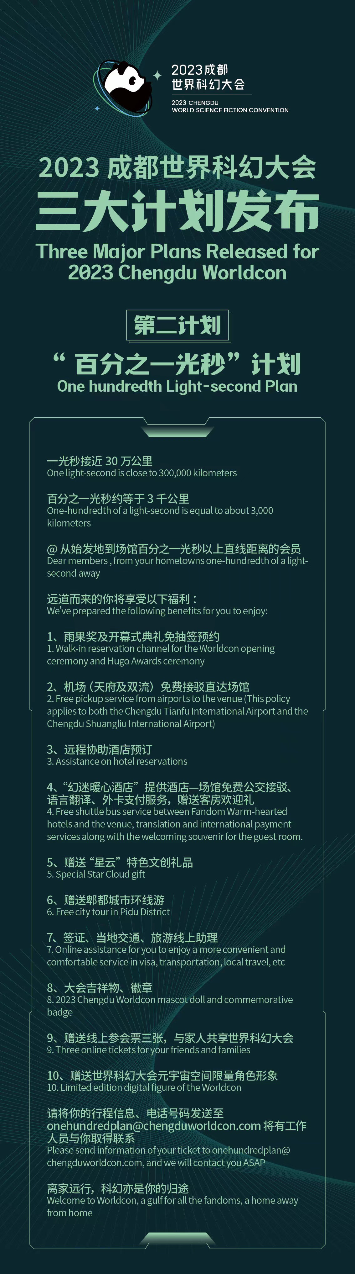 对于远道而来的国外幻迷,组委会特别设置了非常浪漫的“百分之一光秒” 共享计划。这部分幻迷将获得旅行助理、通勤接驳、星云礼包、雨果奖及开幕式免抽签观礼名额、亲友赠票、大会元宇宙空间限量角色形象等福利。
