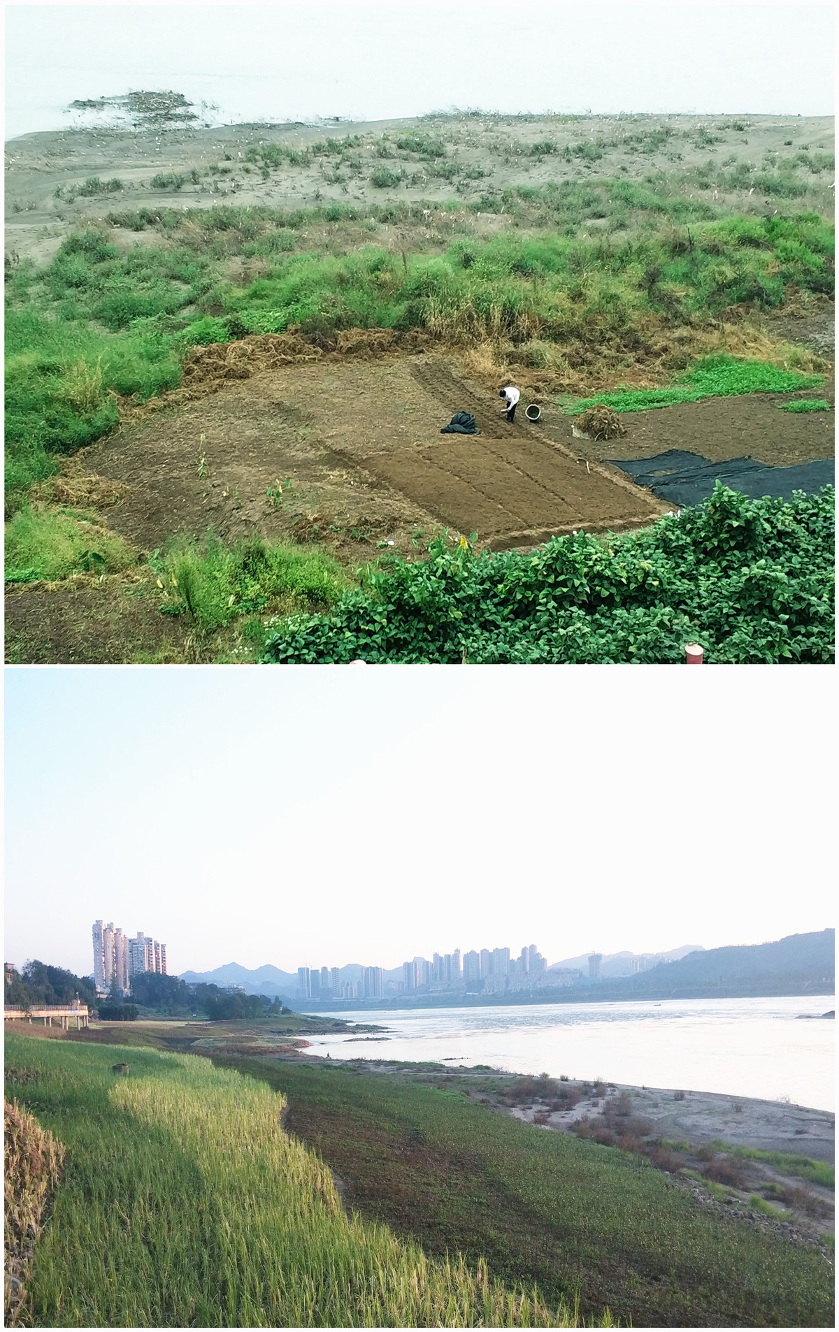 老鹰坵生态湿地公园生态环境整治前(上)和整治后(下)对比图。四川泸州(长江)经济开发区项目建设局供图