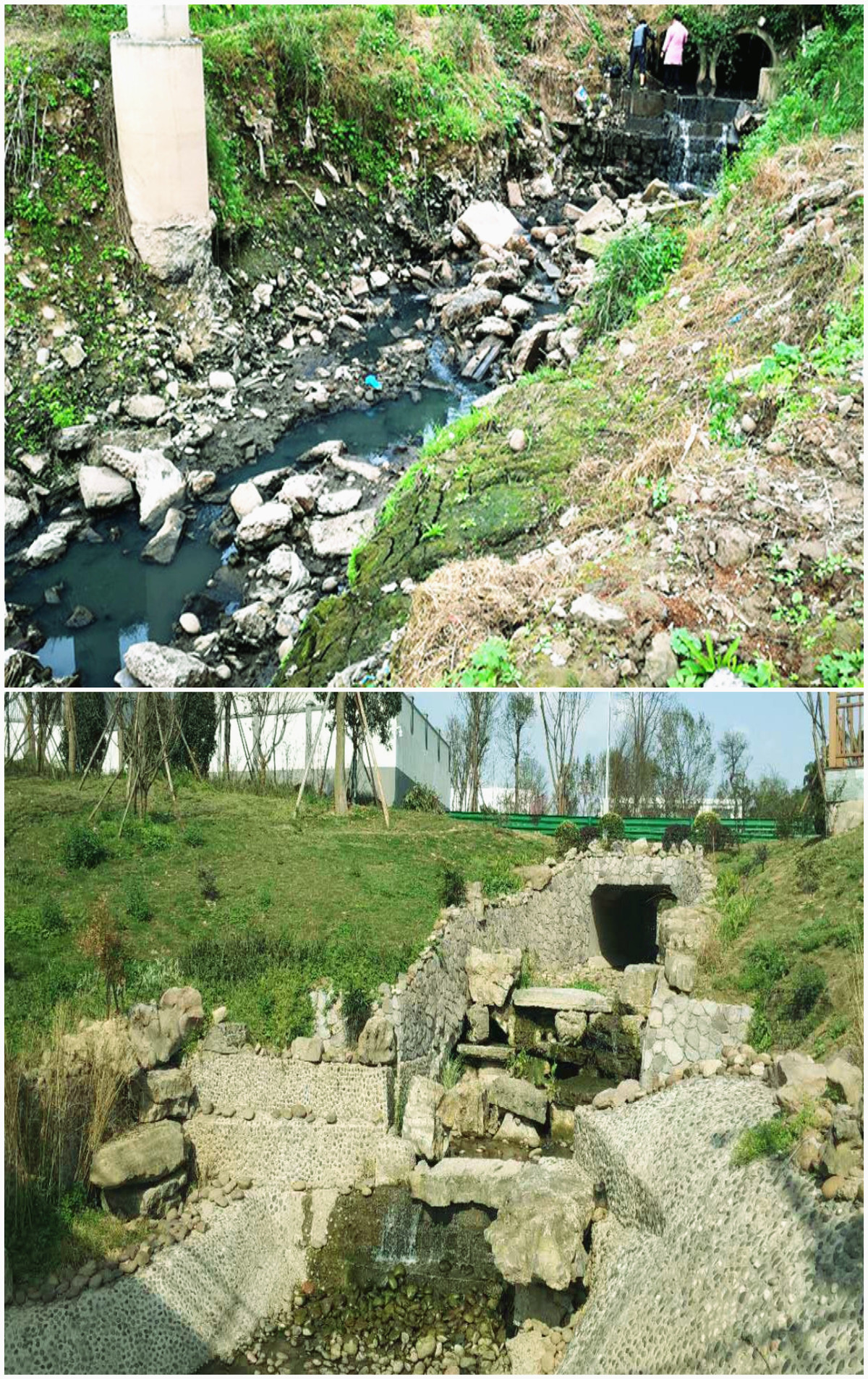 老鹰坵生态湿地公园生态入江排口整治前(上)和整治后(下)对比图。四川泸州(长江)经济开发区项目建设局供图