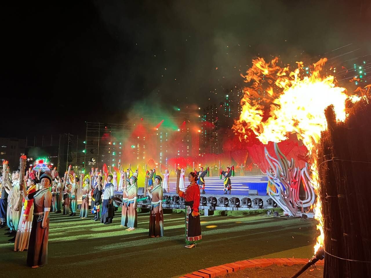 8月18日,“燃情果园新城•放歌青铜古都”———2023凉山盐源火把节开幕式在凉山彝族自治州盐源县举行,歌舞、烟花、篝火将这座城市的热情点燃,夜幕降临,早已按捺不住的乡亲父老跟随着火把跃动起来……