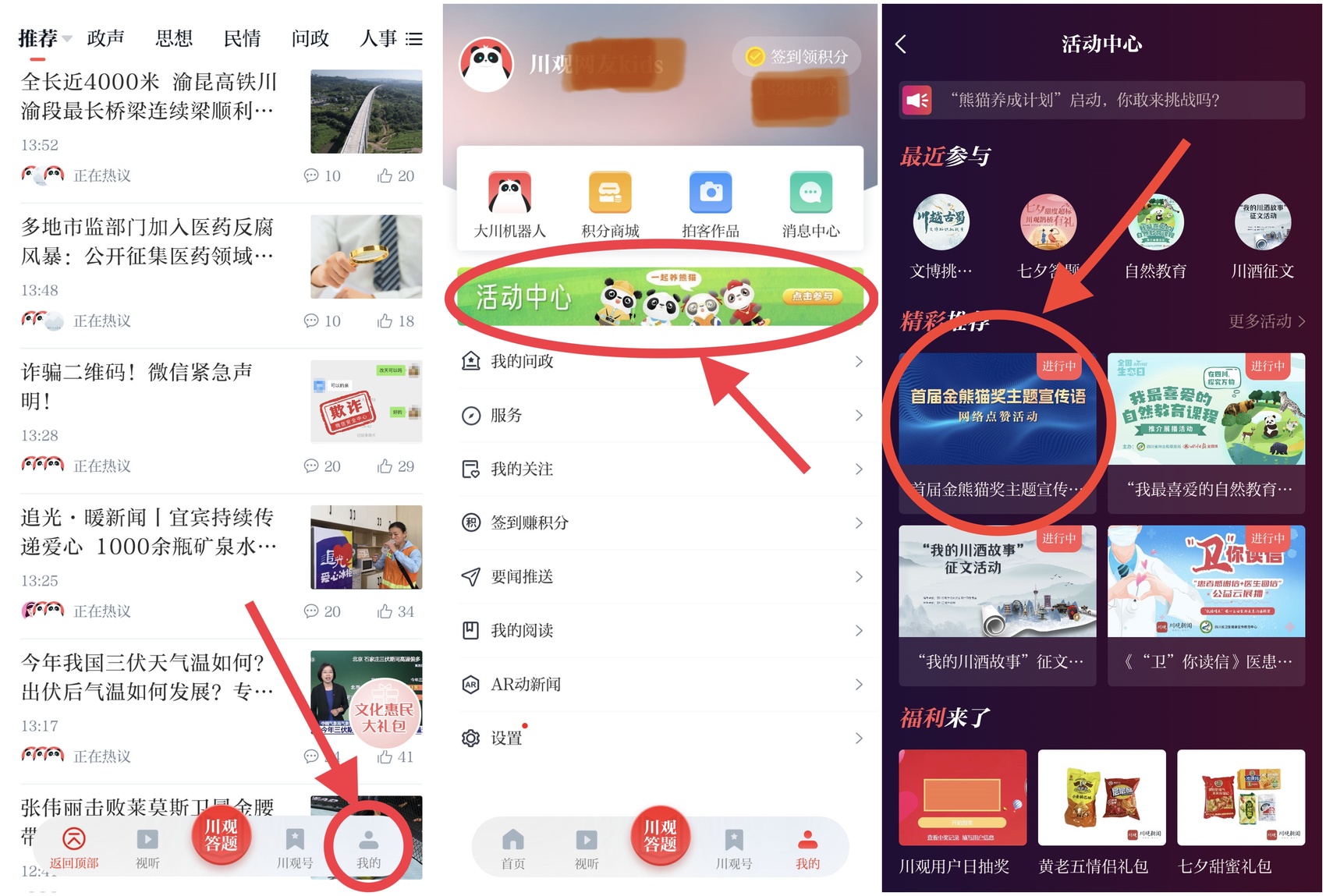 方式二:在川观新闻客户端首页,“我的”版块,点击“活动中心”,找到首届金熊猫奖主题宣传语网络点赞活动图片,点击参与活动。