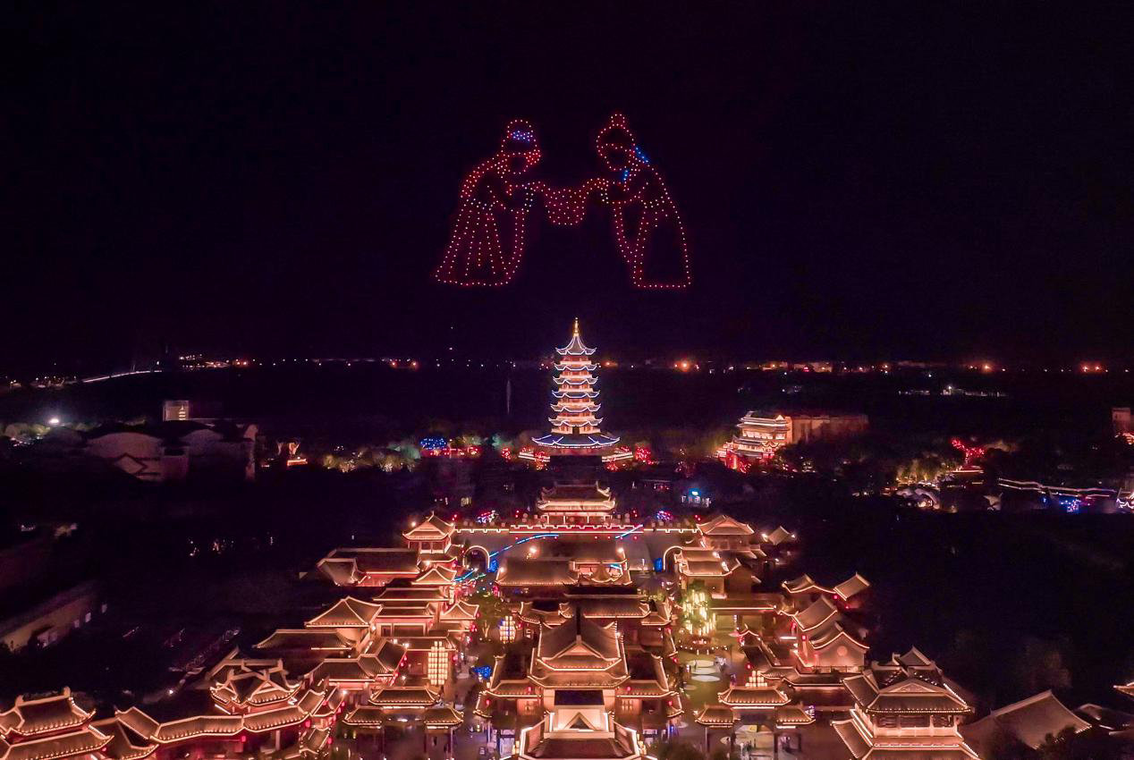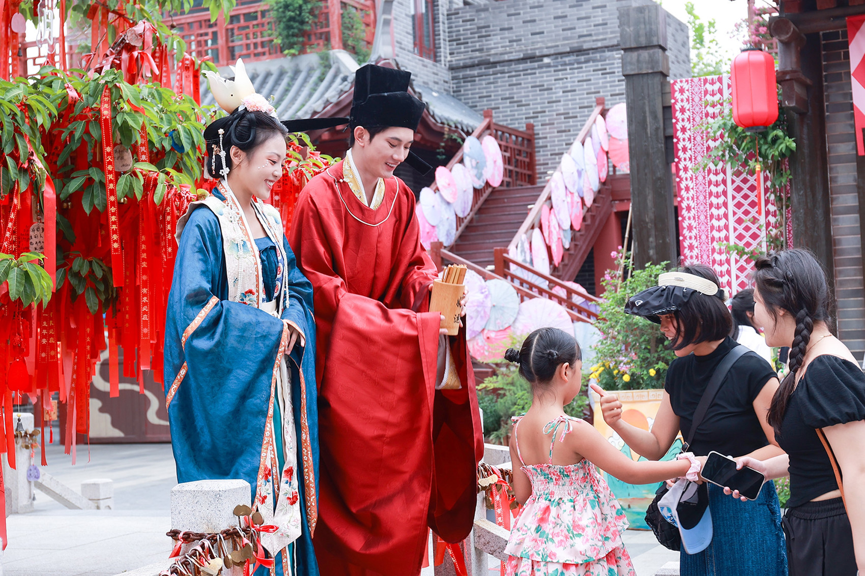 在这座以国风为主题的乐园里,达人和模特们身着各式婚服漫步于红毯,举手投足间展示出古时婚礼的端庄与祥瑞。月老送签、绣球争喜等体验活动不仅让游客沉醉在华美的服饰和隆重的典礼中,还能更直观地了解中国古代婚礼的习俗和文化,感受中式婚礼的独特魅力。
