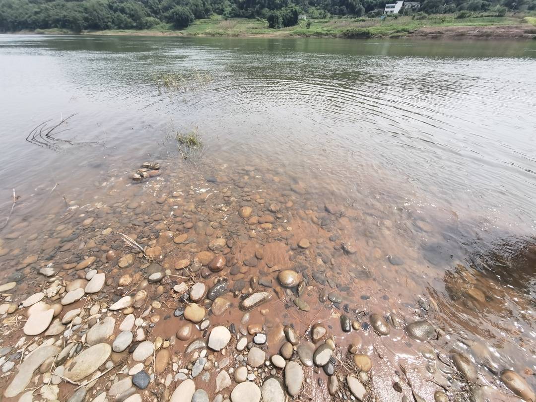 站在岸上,可以清晰看到近处浅水滩有许多鹅卵石在水底,成人下到浅水处,淹及小腿处。整个河面,开阔处有上百米,而肉眼可见的浅水滩不过一两米宽度。