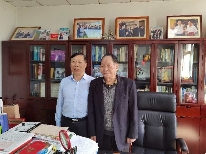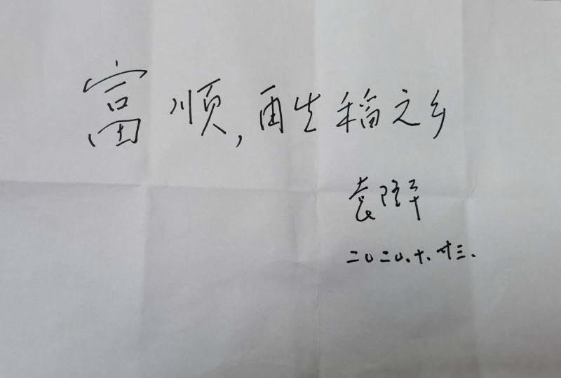 10月23日,自贡市富顺县委书记邹登权前往湖南农科院拜访“杂交水稻之父”袁隆平院士,汇报该县再生稻情况。袁隆平院士现场题字:“富顺,再生稻之乡”。