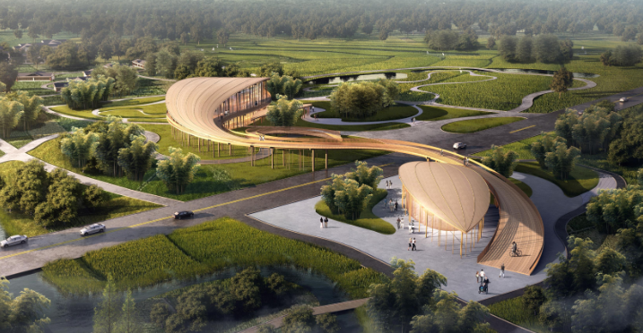 从设计图上看,建筑如两片散落在大地的“竹叶”,巧妙地与乡村自然环境融合。建筑跨越白塔湖旅游公路,由道路北侧的竹编非遗展厅和道路南侧的桤木河湿地公园骑行服务点组成。通过跨越公路的一条“飞廊”,连接起南北两侧的“竹叶”,行人可在“飞廊”上休憩,或者从此处步行、骑行到达南侧的桤木河湿地公园。