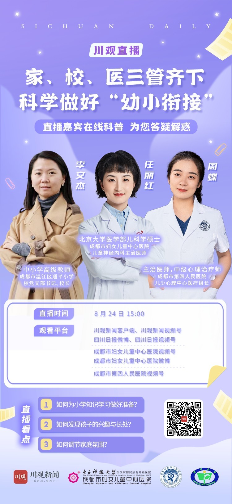 8月24日,川观新闻联合成都市妇女儿童中心医院、成都市第四人民医院、成都市温江区通平小学校,围绕“幼小衔接”主题进行直播科普,给出科学、实用的指导意见,为家长们答疑解惑。