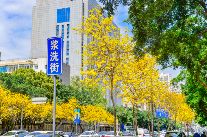 每当春季,成都市洗面桥街和浆洗街的道路两旁,黄花风铃木花盛开,明亮的黄色花朵轻舞飞扬,街道如同披上了“黄金甲”,总会吸引市民游客纷纷打卡拍照。