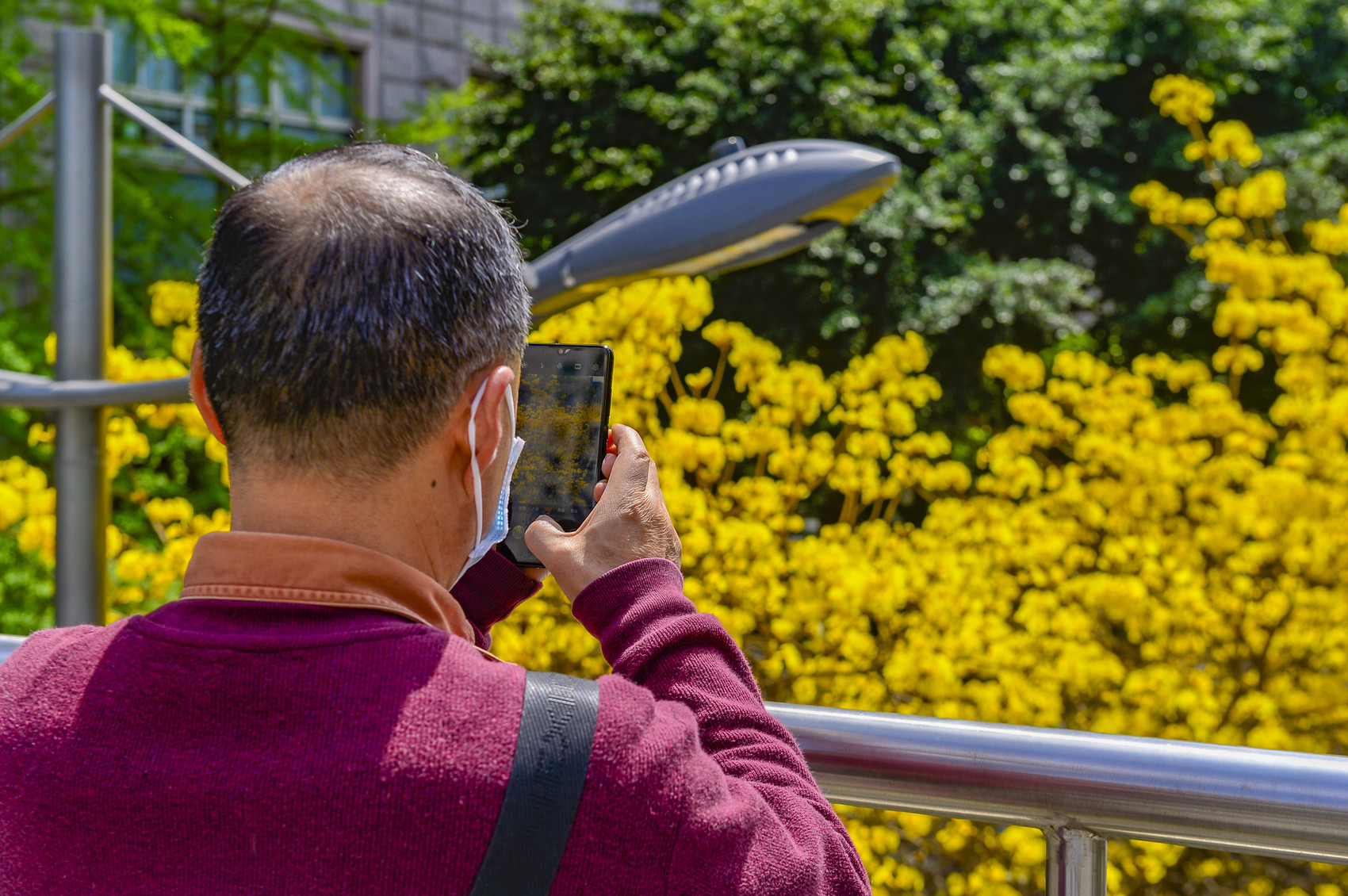 成都街头,市民在拍摄黄花风铃木。