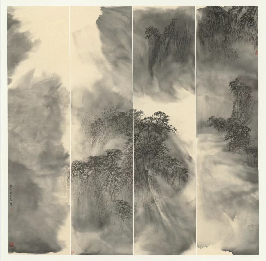 钟士敏长期从事山水画的研究与探索,他的作品既有宋画的高洁雅丽,又有元人的逸气浩邈,在精细唯美的画面中古意盎然。他一边师古人,一边师造化,将传统笔墨融入巴山蜀水之中。《烟山似吾邻》创作于2019年,描绘了远山云雾袅绕的场景,将传统国画由三远法构建的散点空间,引入西画的层次感,画面清透,富有空间感。云烟层层翻涌,随气而动,自然的氤氲运化,云化雨,雨成烟,悄然融入大地。正是有这天地间的气息流贯,才有万物的生生不息。他在长期的笔墨探索中,终成一家之法,以淋漓的笔墨,写胸中逸气,游心于物之初。