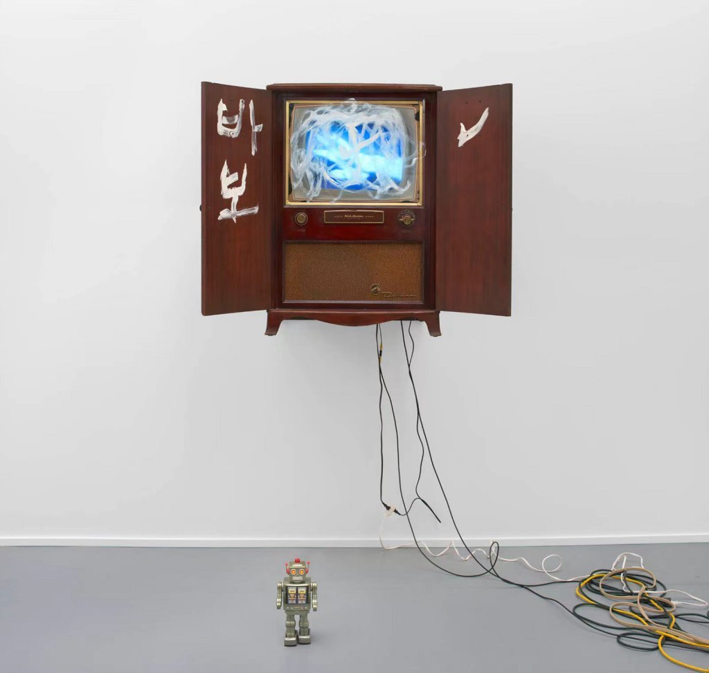 韩国艺术家白南准是影像艺术的先驱之一,他的参展作品《无题》创作于1996年,由老式电视机柜、单通道影像、丙烯酸涂料、玩具机器人共同构成。上世纪60年代,电子影像在生活中日渐普及,白南准将“电视”带入艺术世界,视之为带有触感的多元感官媒介和题材,传达电子技术发展将给人类带来的巨大影响。