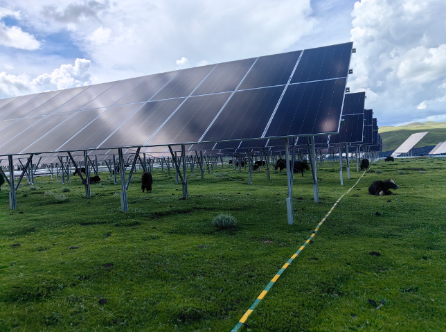 “牦牛养殖是当地的传统产业。为了带动当地畜牧产业发展,我们将光伏支架做了特殊设计,进行了增高,并且利用光伏面板可遮阴、能集水的特性,在下方种植了优质牧草,打造了牧光互补的示范区。”刘宏德说。