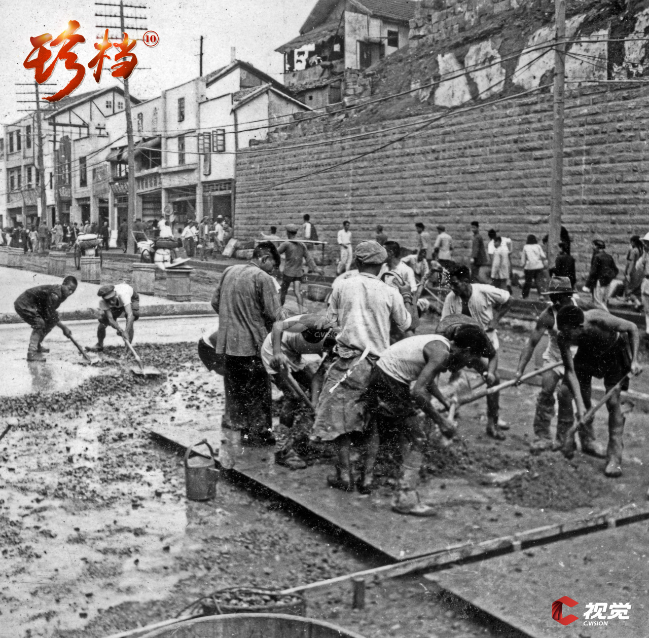 1950年,筑路工人正在铺设重庆市邹容路一段的水泥路面。
