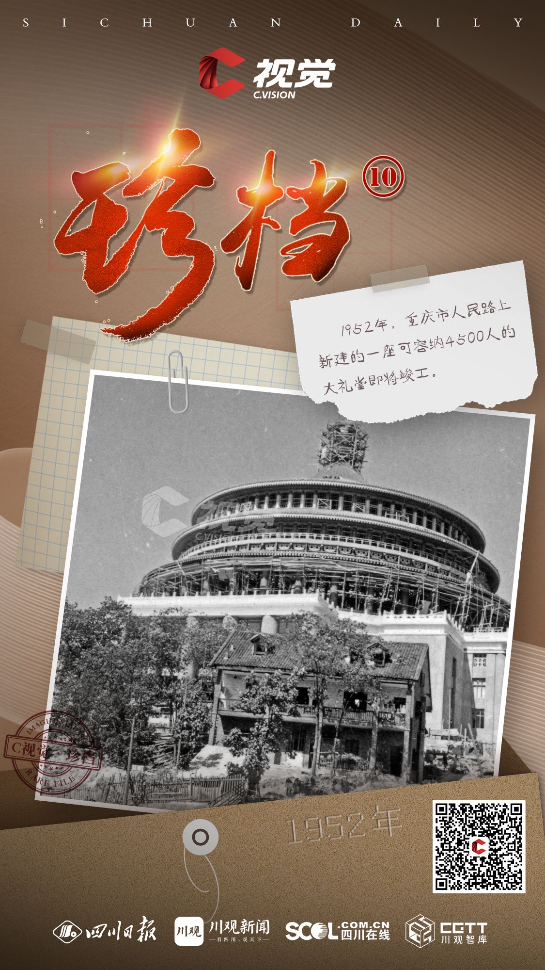 1952年,重庆市人民路上新建的一座可容纳4500人的大礼堂即将竣工。