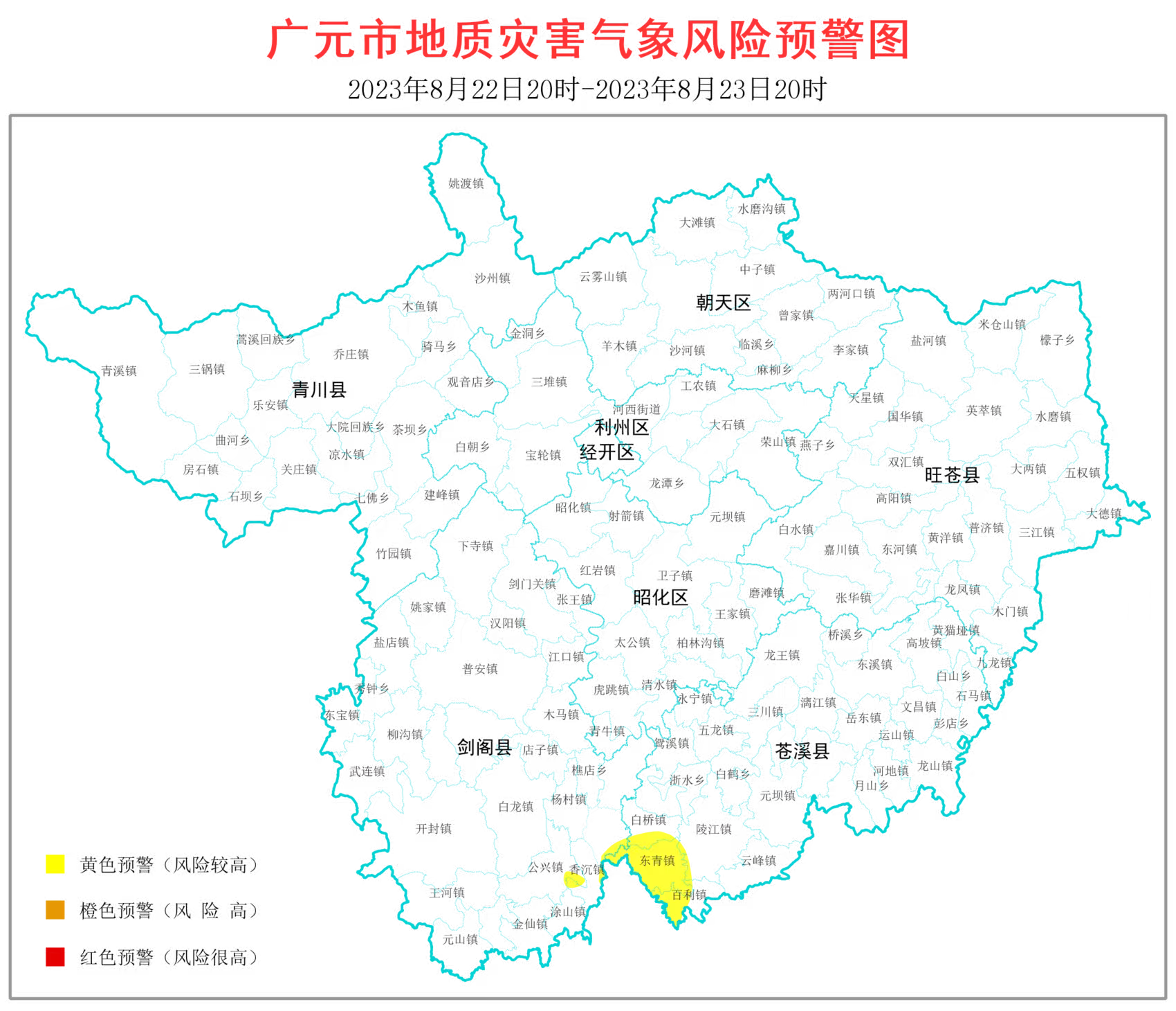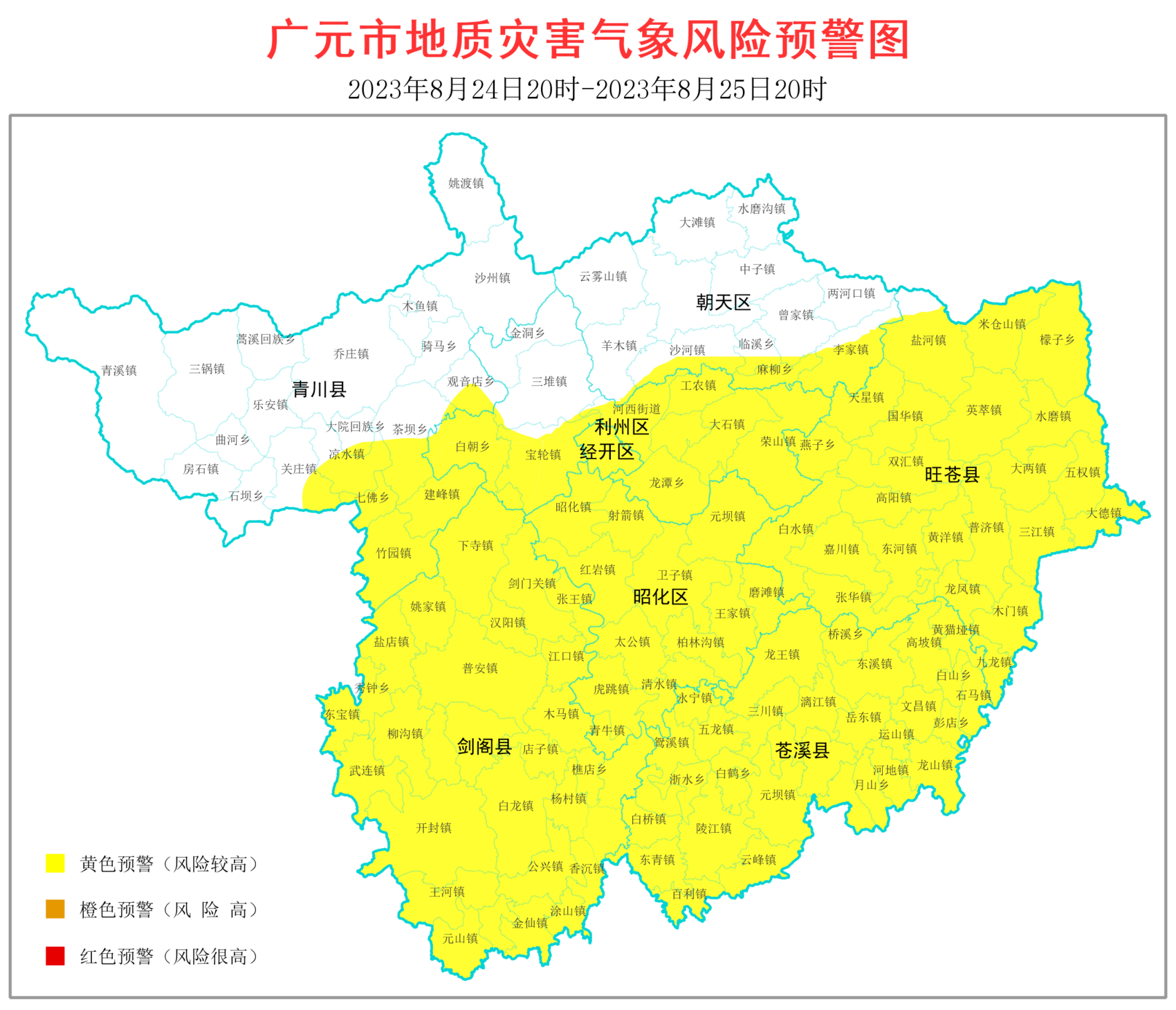 广元地质灾害指挥部同步发布地质灾害气象风险预警:8月24日20时-8月25日20时,苍溪县、旺苍县、剑阁县、昭化区、广元经开区全境,青川县关庄镇等8个乡镇、利州区荣山镇等9个乡镇(含街道办事处)、朝天区羊木镇等6个乡镇发生地质灾害的风险较高(黄色预警)。