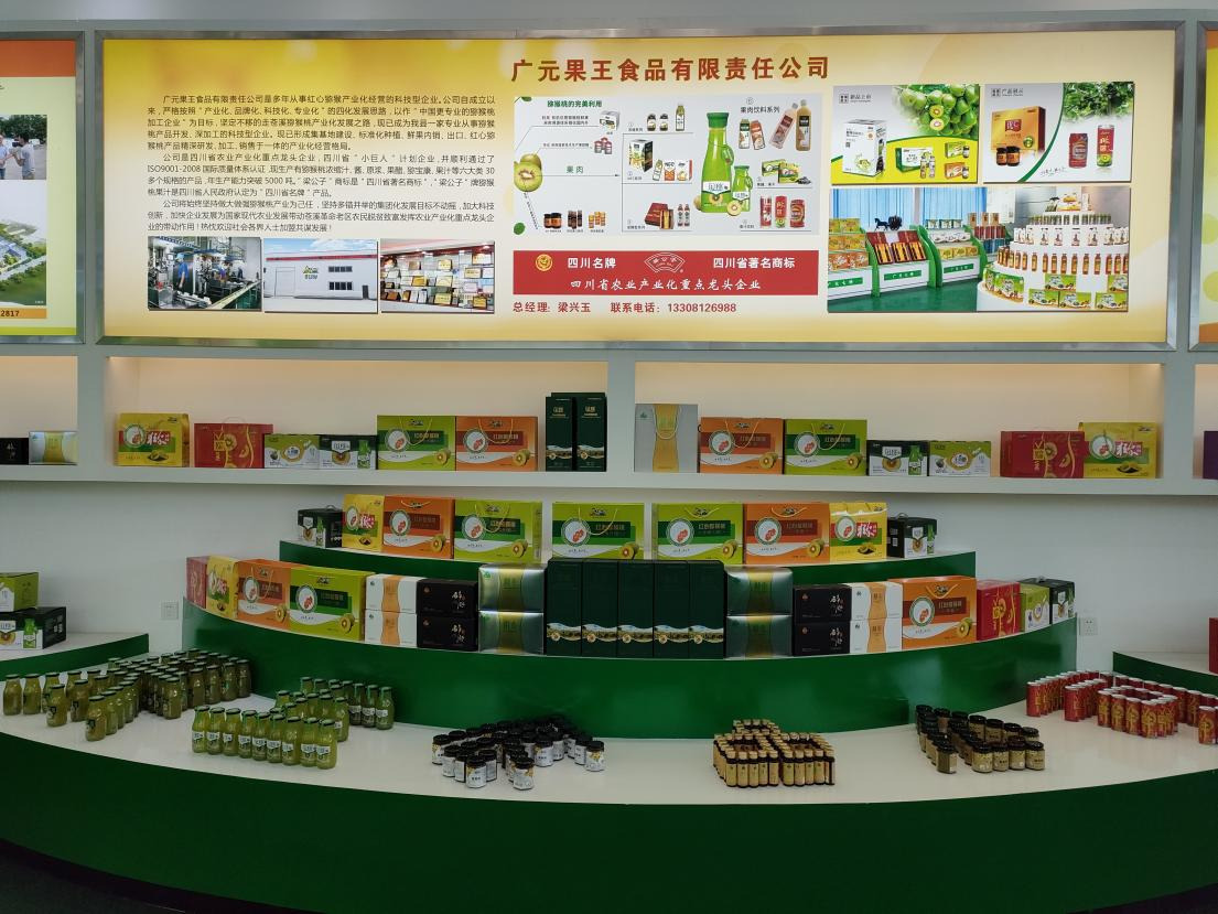 猕猴桃饮料、猕猴桃果干、猕猴桃酵素……走进苍溪县猕猴桃现代农业园区加工营销中心,映入眼帘的是大厅内摆放的不同种类的猕猴桃加工产品。