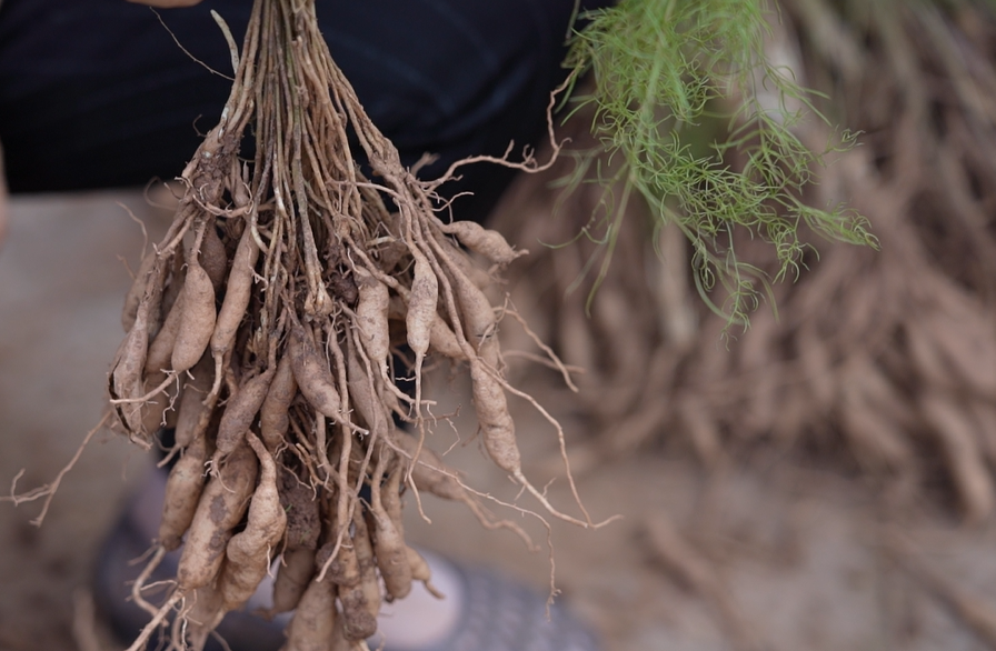 来到刚刚收完玉米的田边,邹丹轻轻挖出一株天冬察看长势。“你可以掰一个尝尝,吃起来有点回甜,还可以加工成天冬酒、天冬膏、天冬蜜饯等。”邹丹说,内江天冬曾是当地人房前屋后种的植物,天冬炖鸡更是常见的家常美味,“这里就是‘中国天冬之乡’”。