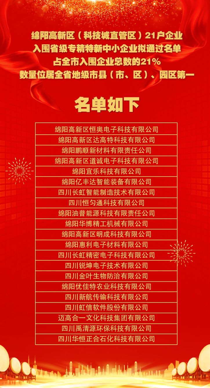 近日,四川省经信厅公示了2023年度四川省专精特新中小企业拟通过名单,其中,绵阳高新区(科技城直管区)共有21户企业入围,占绵阳市入围企业总数的21%,数量位居全省地级市县(市、区)、园区第一。