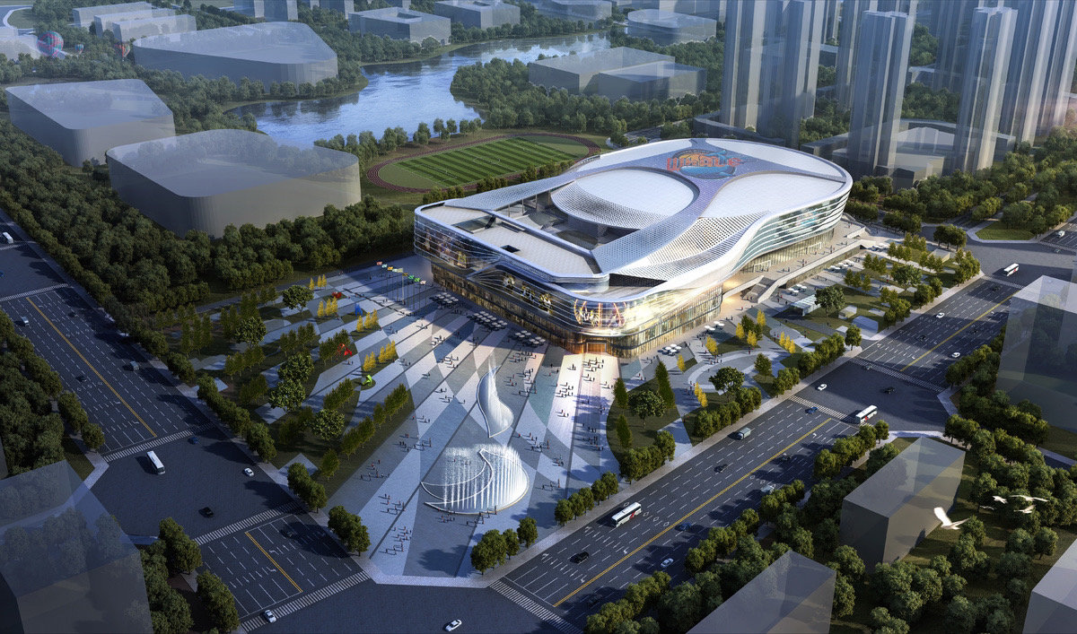从建筑外观看,金强国际赛事中心模拟蓝鲸奋力游动、勇往直前的身形,意为“鲸”涛骇浪;外部纹理提取自古文字“鱼凫”,象征温江地区作为古蜀国发源地的文化渊源,传承古蜀文化的精神烙印。从专业角度看,金强国际赛事中心是全国首个集大型体育场馆、健身博览及休闲式公园等为一体的一站式全能体育综合体项目,场馆规模、大屏技术、舞台灯光等软硬件设施均达到NBA专业级别,完全符合电影摄制所需高端专业的UFC(终极格斗冠军赛)舞台标准。