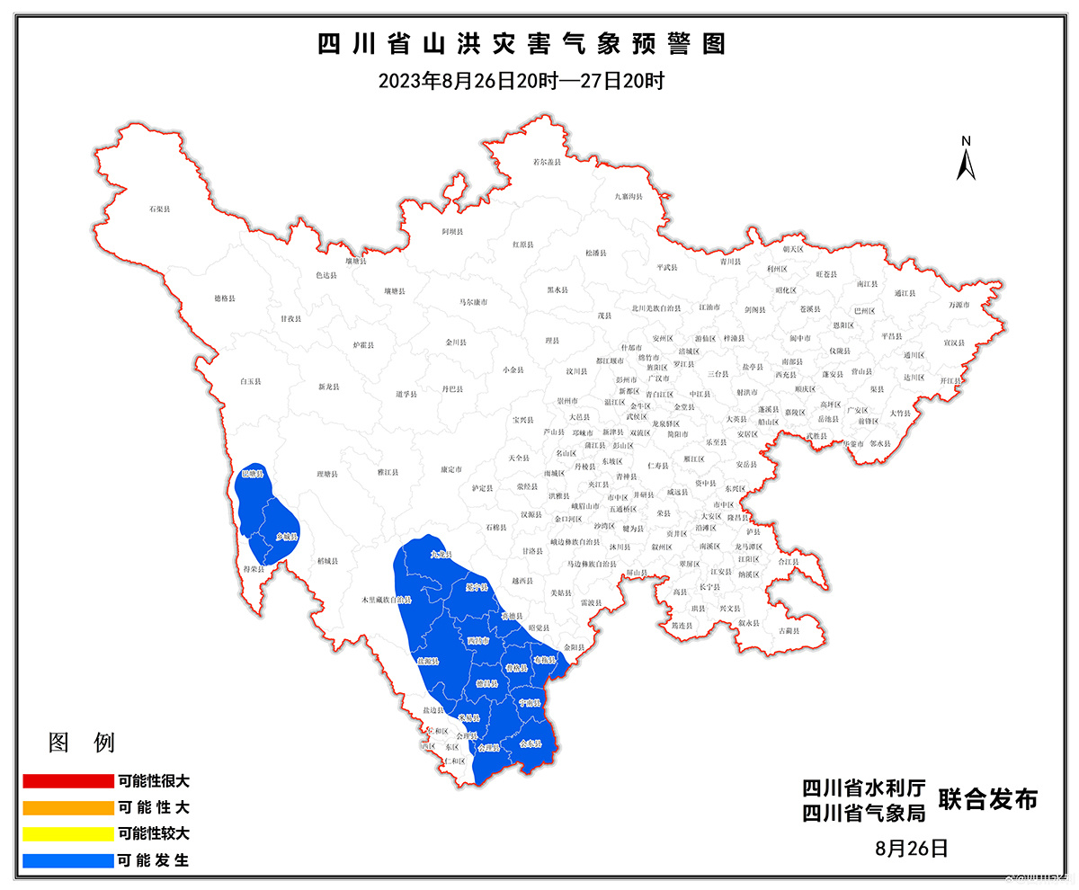8月26日17时,四川省水利厅、四川省气象局联合发布山洪灾害蓝色预警。