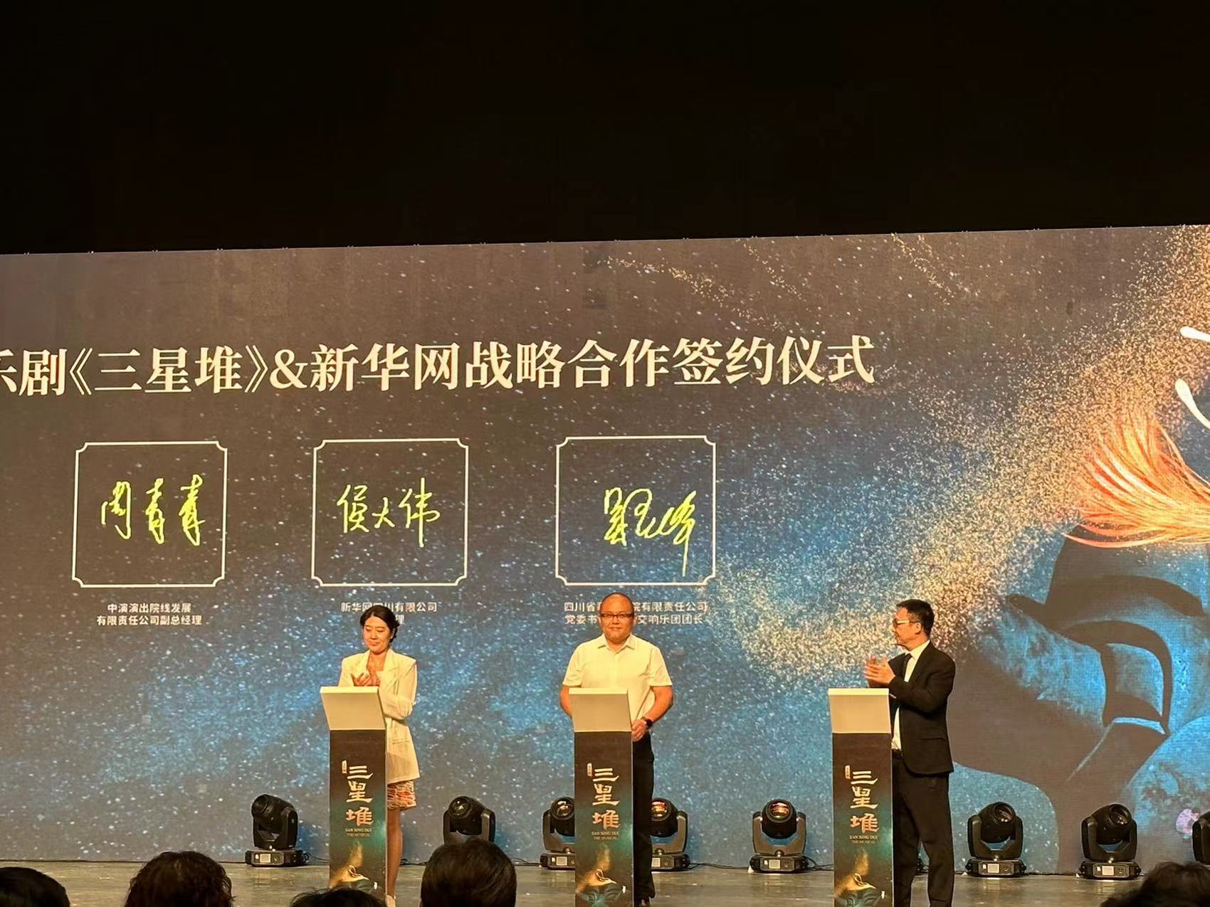 发布会现场,四川省歌舞剧院有限责任公司党委书记、四川交响乐团团长吴灵峰,中演演出院线发展有限责任公司副总经理周青青,新华网四川有限公司总经理侯大伟签署三方战略合作协议,将共同助力音乐剧《三星堆》线上线下传播,全面提升剧目在国内外的影响力。