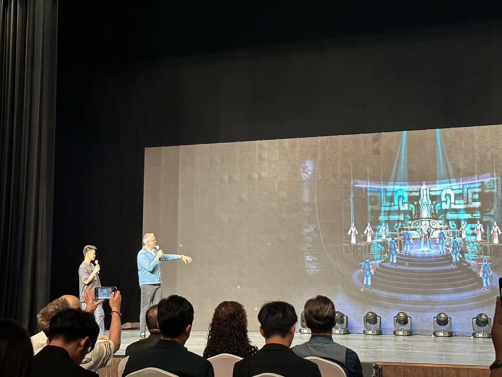 “我们的故事一部分在古蜀国,一部分在现代,这之中也有穿插,正如大家看到的,有一部分人考古现场,有一部分人在三星堆古代的生活场景里。”导演汤姆·萨瑟兰说道,他曾荣获2011年伦敦西区最佳导演奖、WhatsOnStage和Off-West End最佳制作奖,并执导托尼奖史诗音乐剧《泰坦尼克号》等作品,介绍完后演员们现场表演了《星空下的约定》的舞蹈片段。