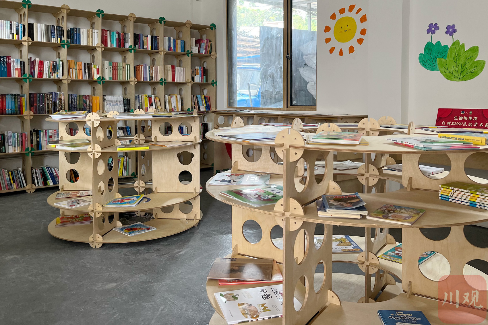 《瓦尔登湖》《醒来的森林》《昆虫记》……公益图书馆位于“天台稻花公社”一楼右侧,设置有两个房间,分别整齐摆放着自然教育和人文社科类的书籍。一大早,志愿者们便和村民们一起做环境布置,有的小孩在志愿者的带领下做着袜子娃娃,有的小孩则仔细翻看着书籍。