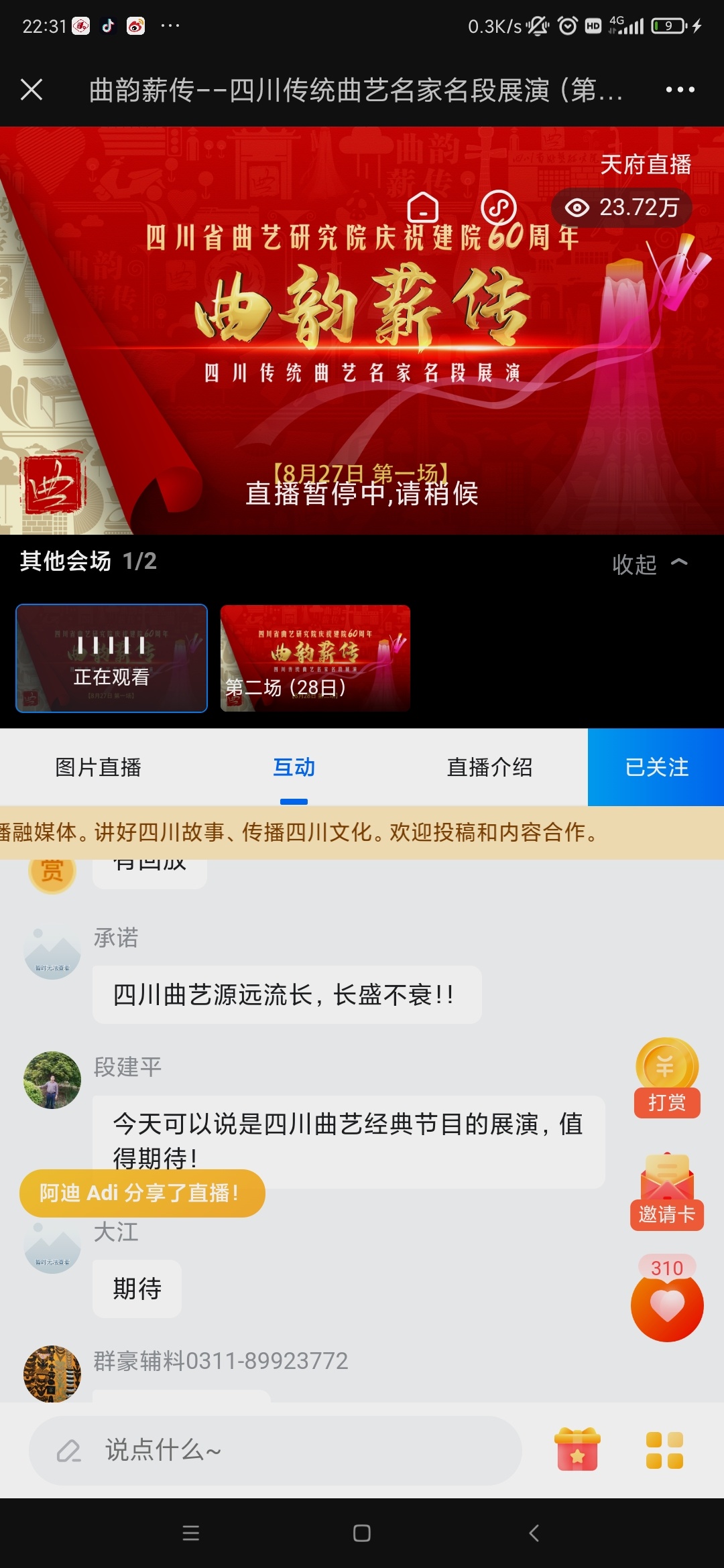 六十一甲子,芳华致青春。四川省曲艺研究院的曲艺人们,本周末与大家相约街头,来到老百姓身边,诚挚地献上这份青春又厚重的表演,探索文旅融合新路径。让大家在接地气的四川曲艺文化中,感受属于天府生活的烟火气。值得一提的是,本次活动也开启了线上网络直播,演出前已经有近万观众预约了演出。今晚演出结束后,直播观看人次已达23.72万人次。