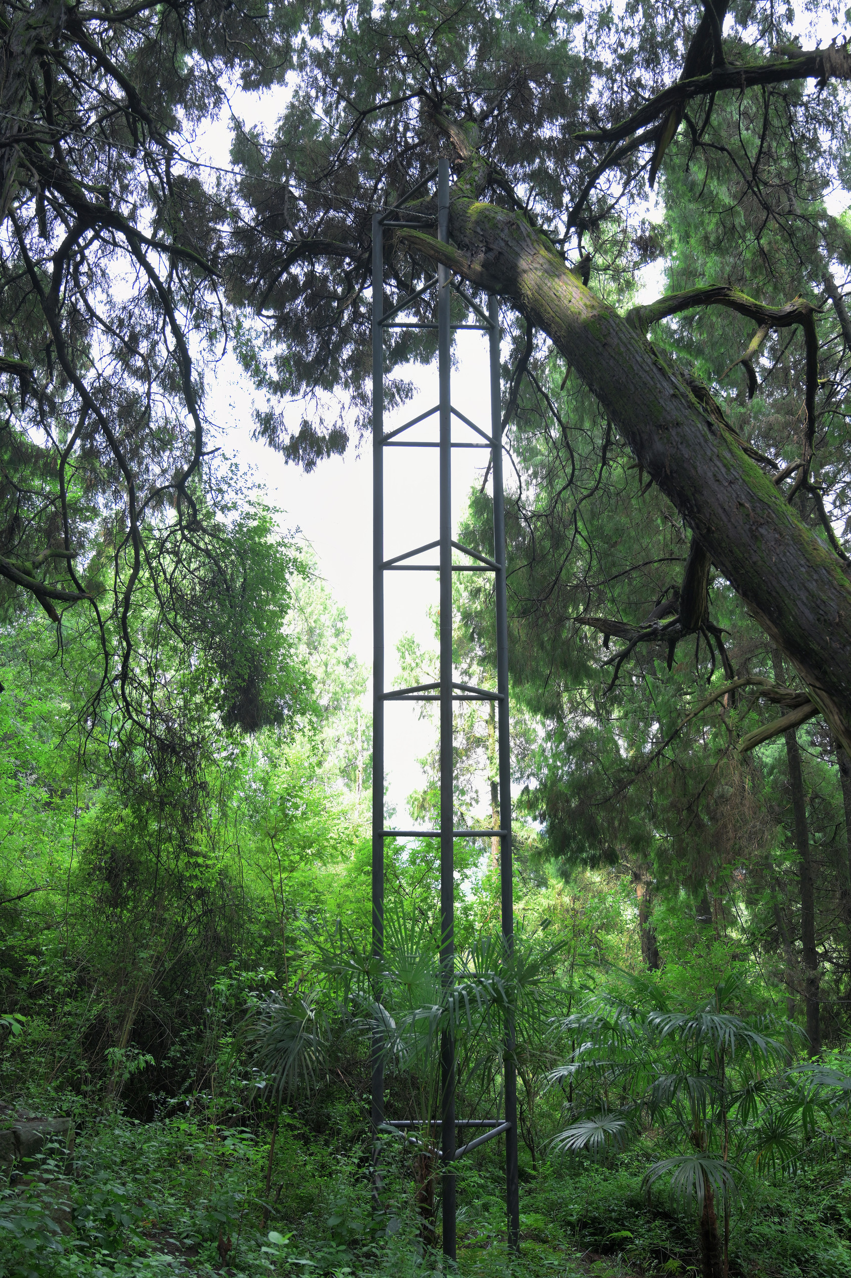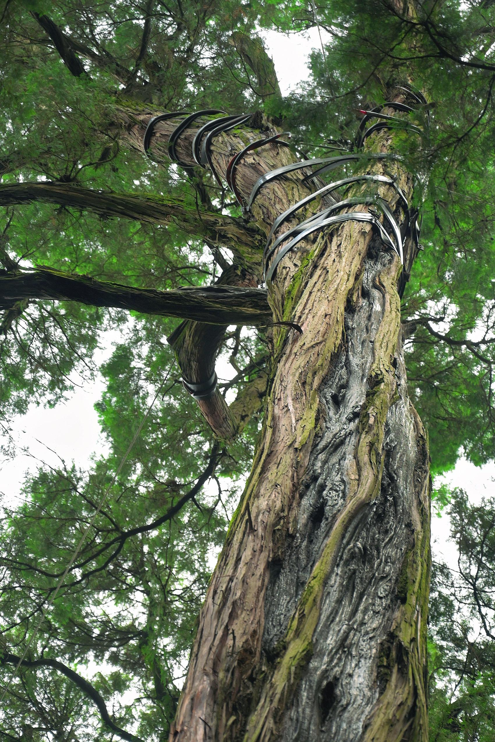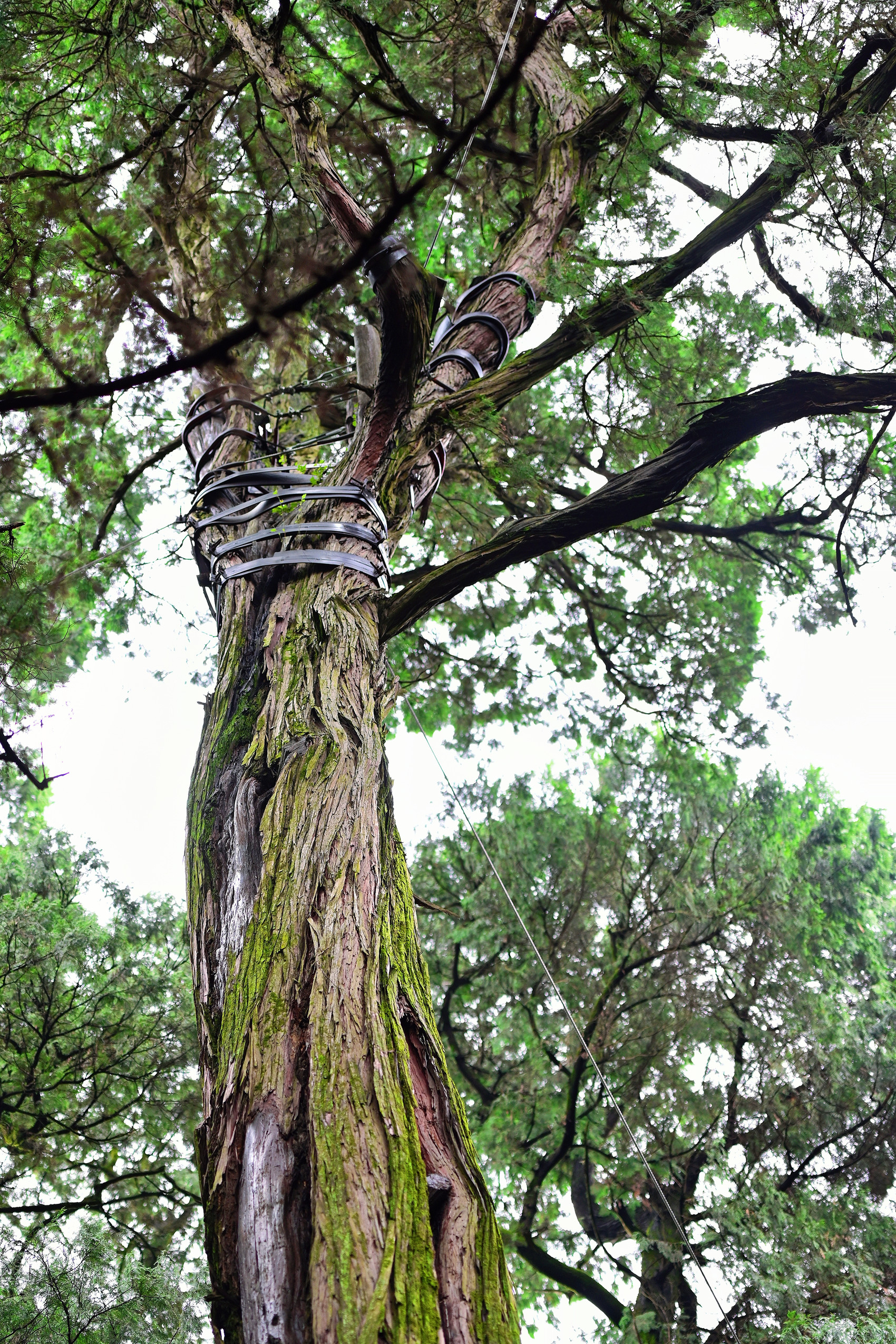 此外,针对古树出现的断裂、倾倒等情况,需要因地制宜利用钢管、木架甚至钢网加以固定。以“剑阁柏”为例,树干上包裹着钢网制成的“铁背心”,从而保证树干的完整和牢固。