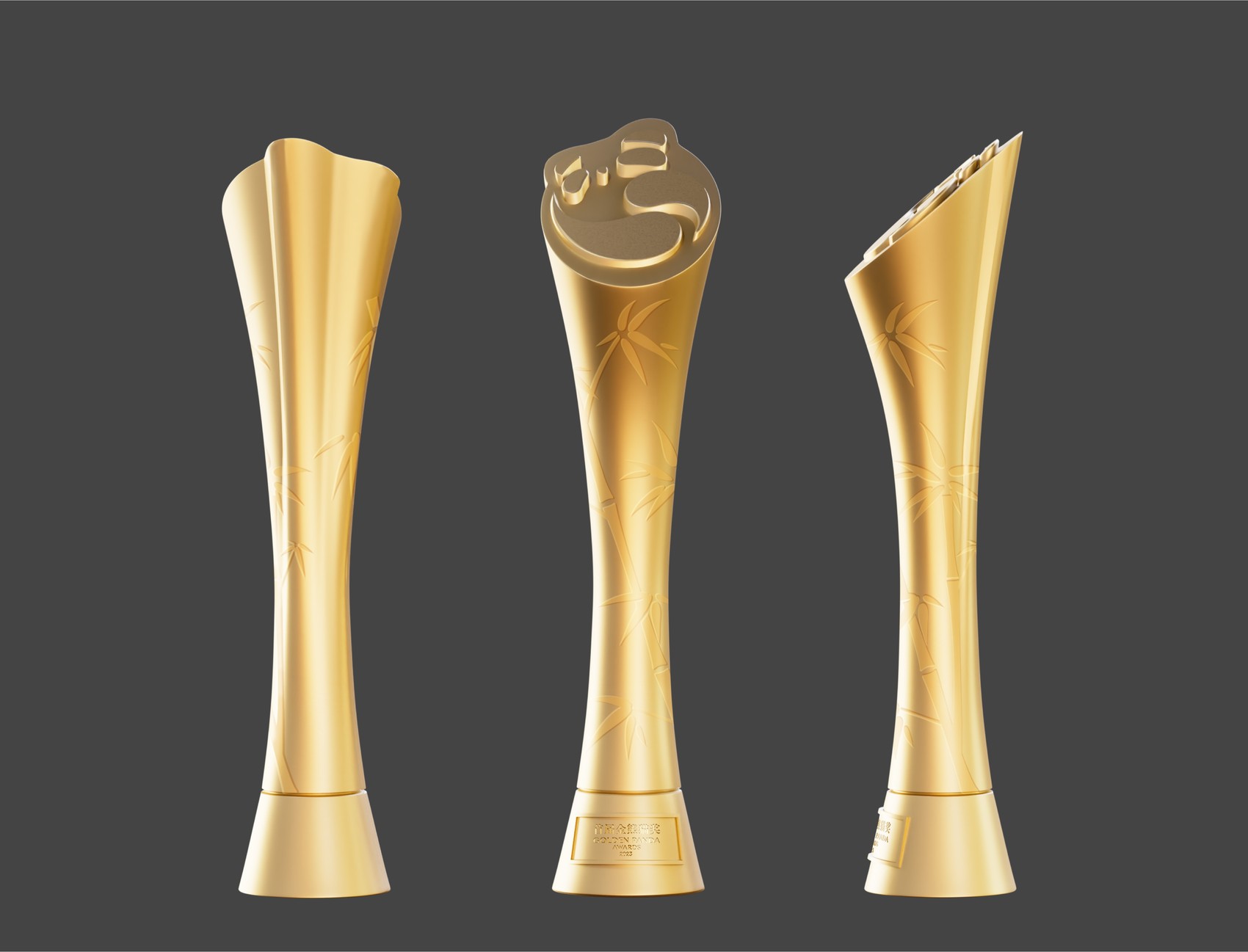 因此,在金熊猫奖奖杯的设计中,团队更多将中国传统元素融合,采用了“熊猫、竹子、竹叶”的视觉组合,并辅之以金色进行呼应。在奖杯杯身,竹节通体延伸、竹叶细致分布,寓意坚韧不拔、繁荣生长;而奖杯顶部,“熊猫印章”图案跃然眼前,如同自带聚光灯一般,同时熊猫被置于竹节顶端也寓意着节节高升与榜样作用。