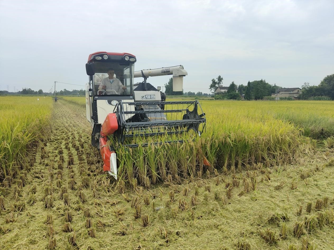 彭州菜稻现代农业园区内,收割机正收割水稻。